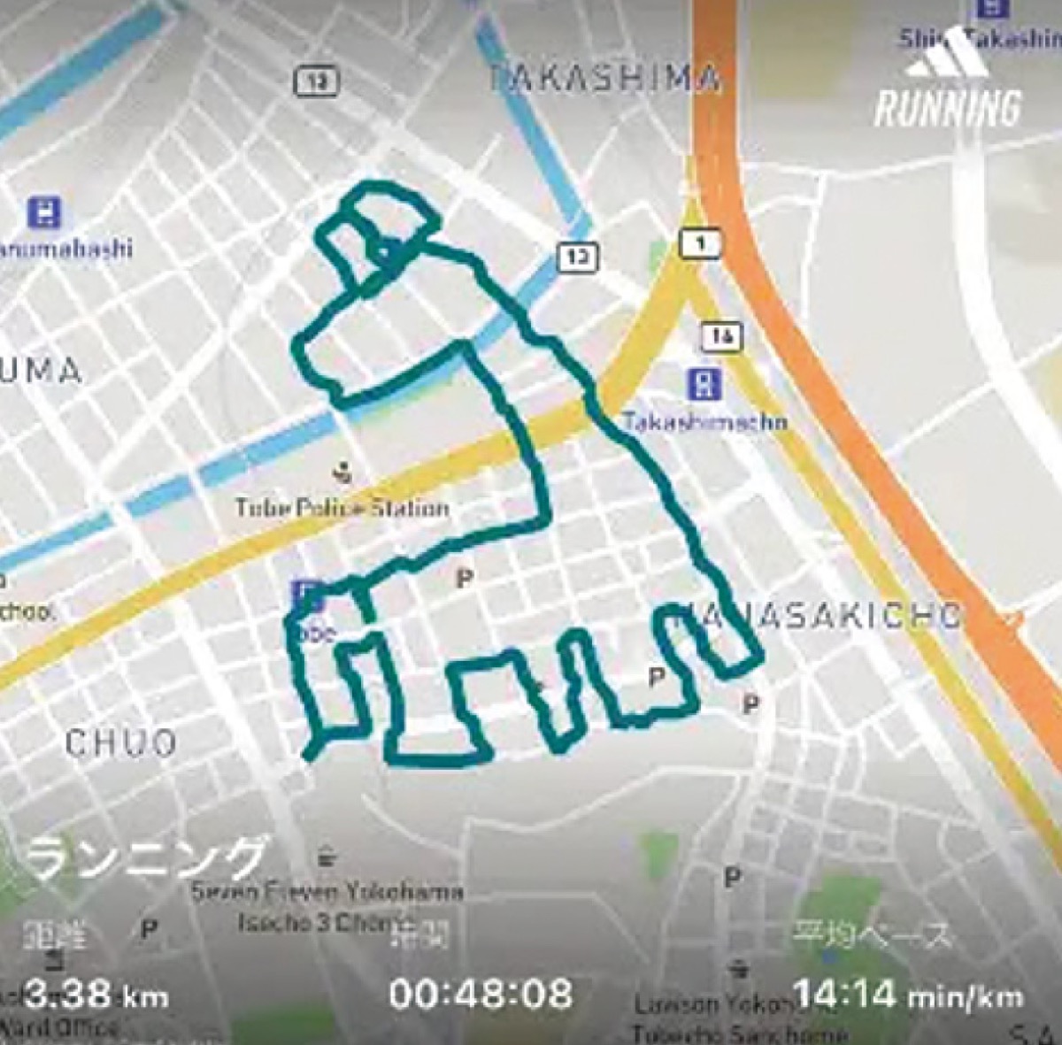 GPSアートとは歩いた場所が線になる「アディダスランニング」というスマートフォンアプリの機能を使うもの。その動線でキリンやリスなどの動物や、ピアノ、ほうきなどの物、また8分音符や「2023」などの記号や数字など、様々なものを描く。