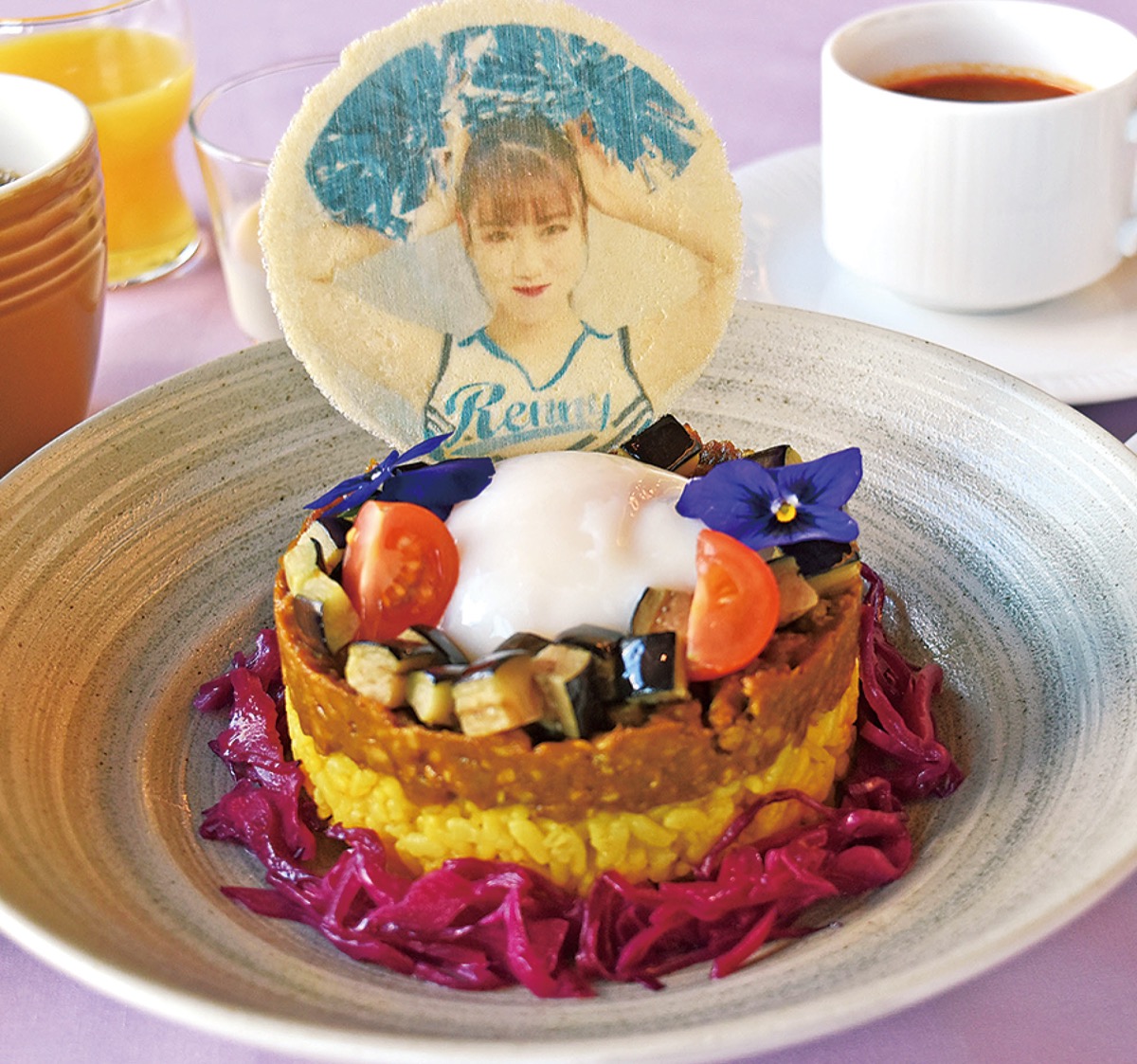 コラボルームや9階ロビーの月のオブジェをはじめ、館内は高城さんのメンバーカラーの「紫」一色に。特大パネルによるフォトスポットが登場するほか、レストランでは大好物だという「茄子とキーマカレー」=写真=などの監修メニューを提供している。
