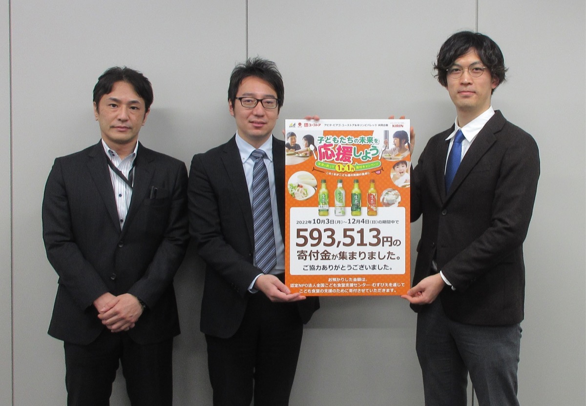 キリンビバレッジ株式会社首都圏統括本部=東京都=は2月24日、こども支援を目的とした商品キャンペーンで集まった59万3513円を、認定NPO法人全国こども食堂支援センター「むすびえ」に寄贈した。