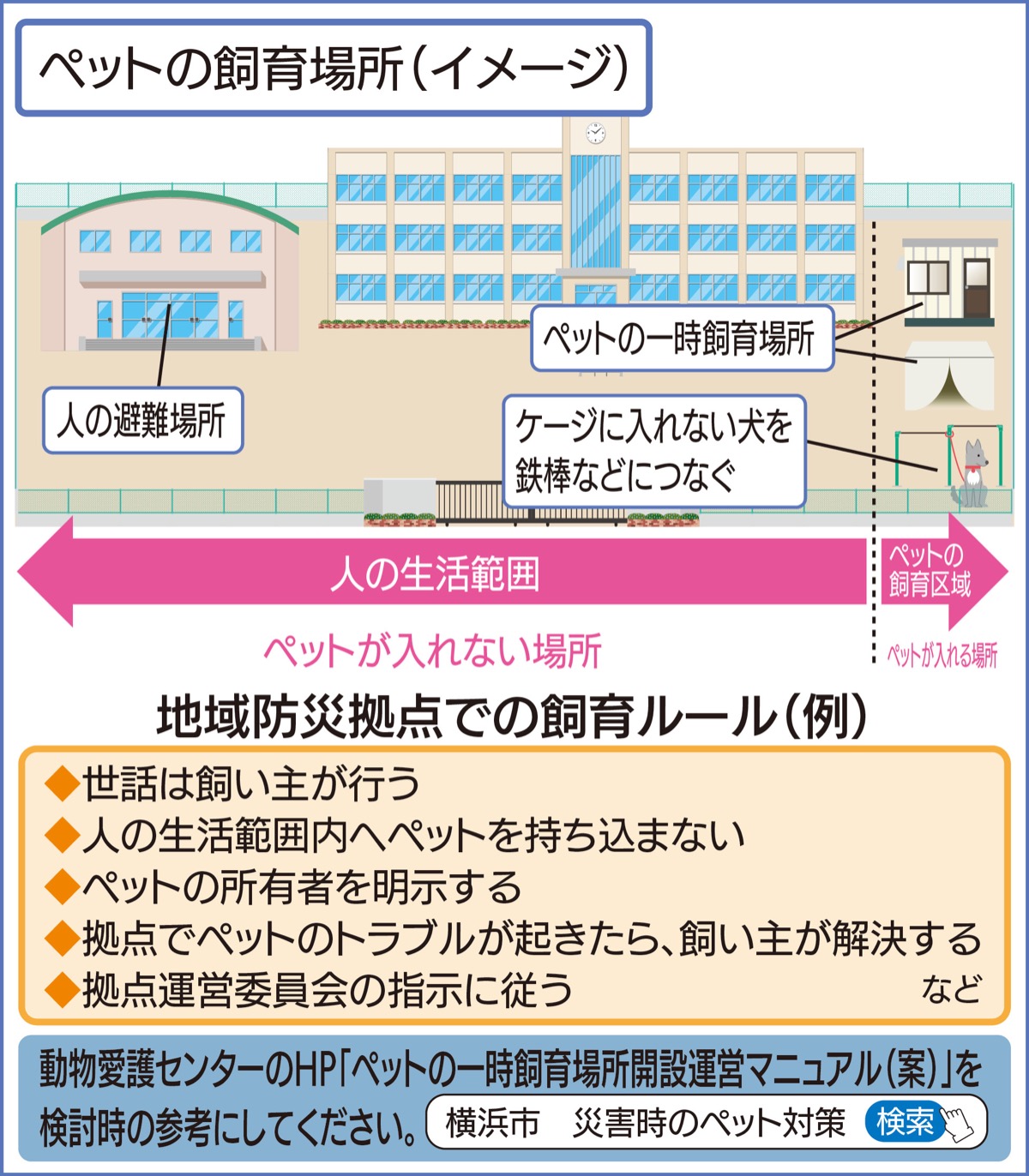 避難所となる地域防災拠点側もペットが避難できる場所の確保や避難所内でのルールを事前に決めておく必要がある。大鳥小学校地域防災拠点では運営委員会とは別に「ペットの災害対策を考える会」を発足し、同行避難訓練や飼育経験のある会員による検討会、獣医師などを講師に招いた講習会を行なっている。