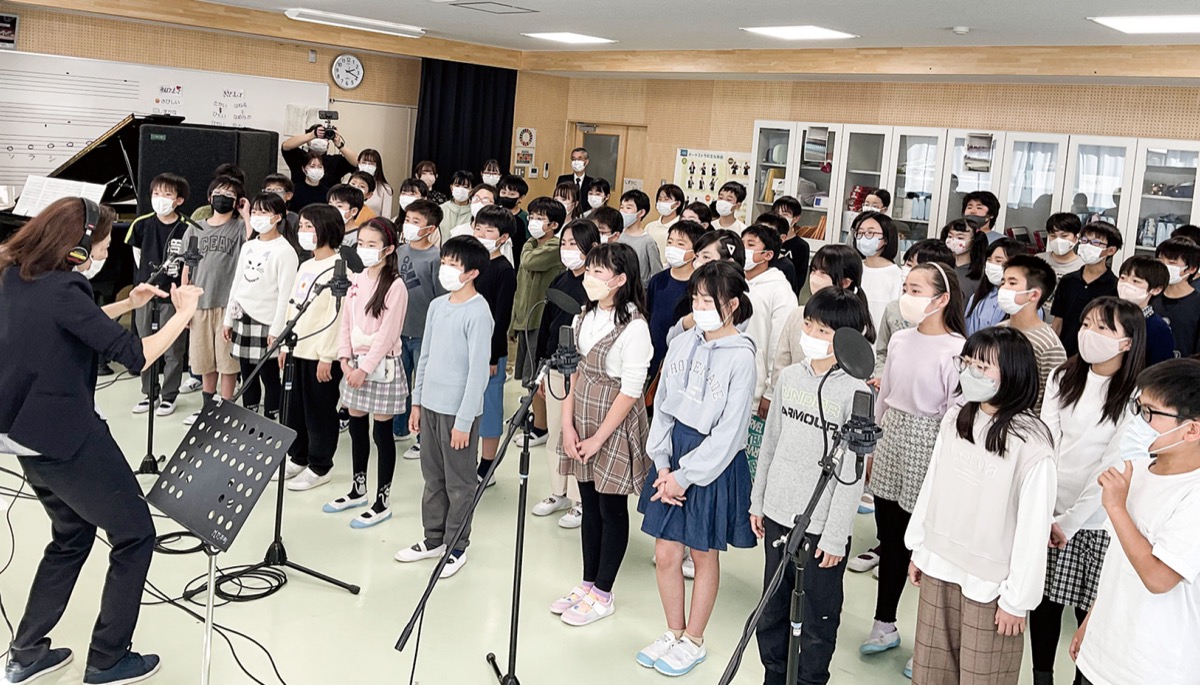 市立みなとみらい本町小学校=西区高島=の5先生の児童67人が自分たちで校歌を作り、3月14日に収録を行った。