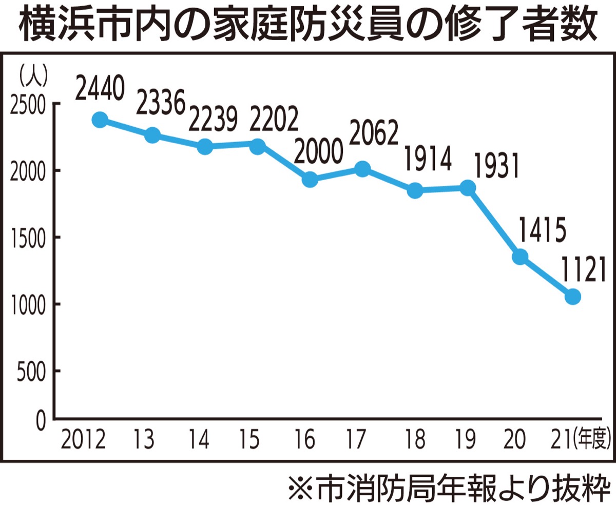 防火・防災に関する知識などを身に付ける「家庭防災員」研修の修了者数が、この10年で半減している。横浜市は4月から受講対象を、自治会町内会の推薦がない人にも拡大。新たに作るウェブサイトも含め、多くの市民に災害へ備えた知識などを広げたい考えだ。