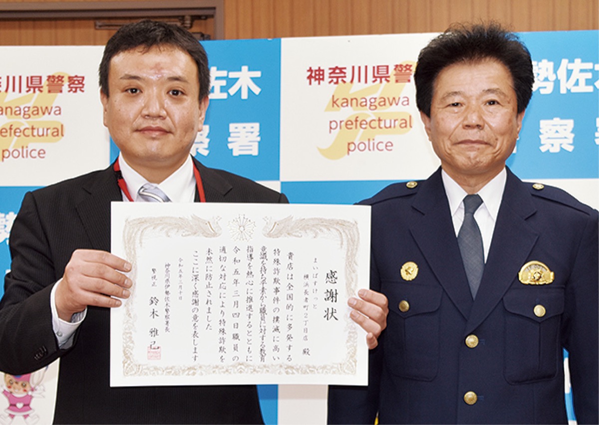 小型食品スーパー、まいばすけっと横浜長者町2丁目店のスタッフが、70代の女性を特殊詐欺の被害から防いだとして3月10日、伊勢佐木警察署で感謝状が贈呈された。