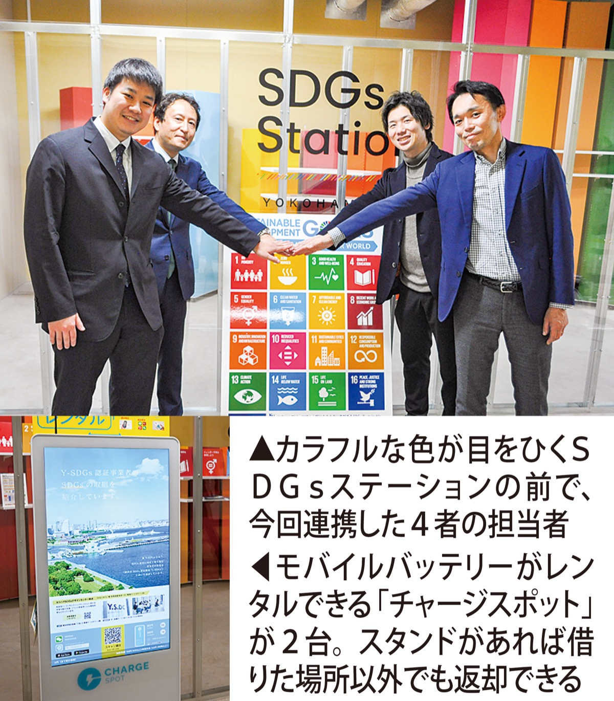 市が認証した「Y─SDGs」事業者の情報発信の場としてSDGs関連の商品の展示や子どもたちの作品展、イベントに活用するほか、スマートフォンの携帯充電器(モバイルバッテリー)のシェアリングサービス「チャージスポット」を常設。165円からレンタルできる。運営する(株)INFORICHの協力で、市のY─SDGs認証事業者の取組がモニターで紹介されるほか、売上げの一部が同施設の運営費にあてられる。利用は始発から終電まで。