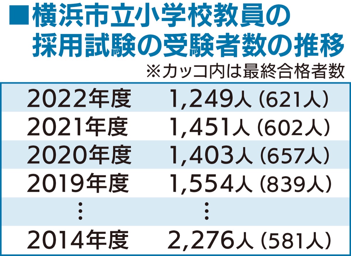 全国的に深刻化している教員不足。市教育委員会によると、市立小学校の採用試験の受験者数も減少傾向にあり、14年度は2276人だったが、22年度は1249人と約1000人減少した。