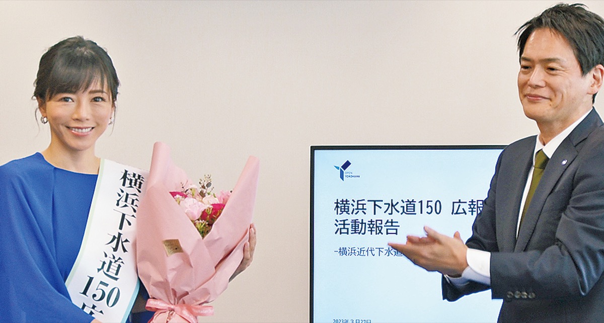 「横浜下水道150広報大使」を務めた俳優・釈由美子さん(44)=市内在住=が3月27日、市役所で山中竹春市長に活動報告を行った。