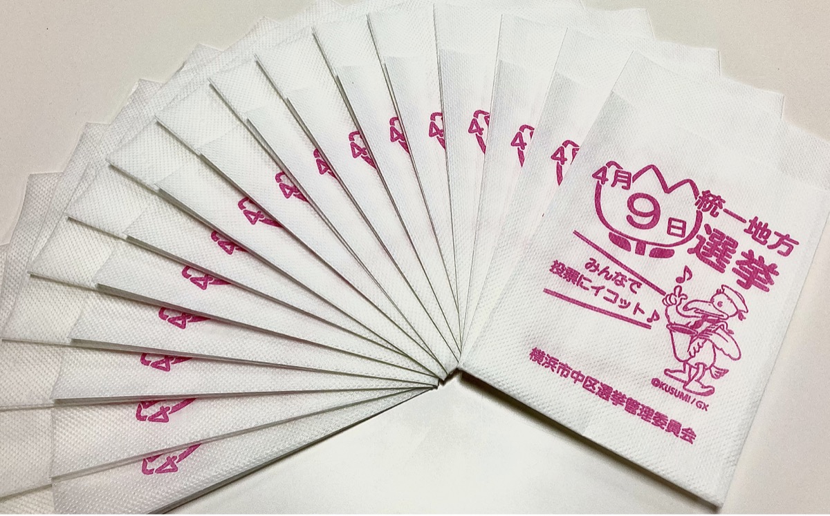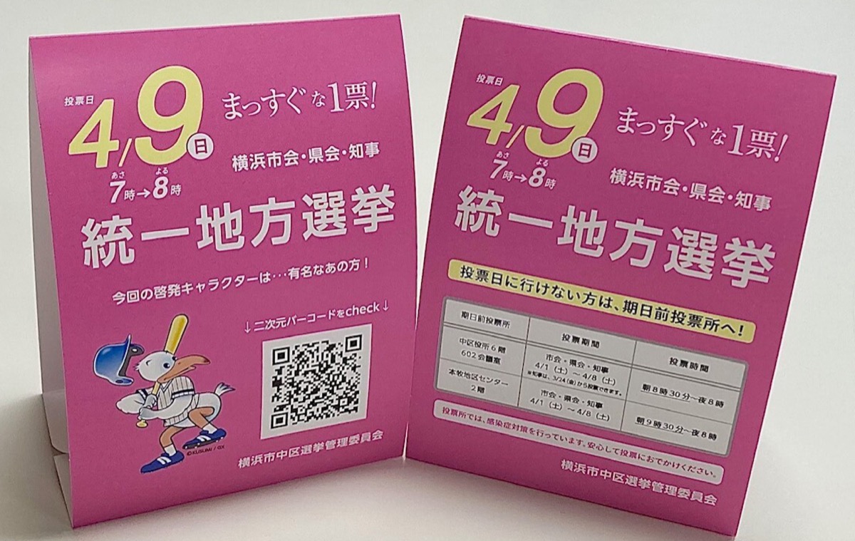 4月9日の統一地方選挙の啓発を目的に、中区選挙管理委員会は同区のマスコットキャラクター「スウィンギー」が描かれた紙ナプキンとPOPを区内で協力を得た飲食店や企業などに配布した。