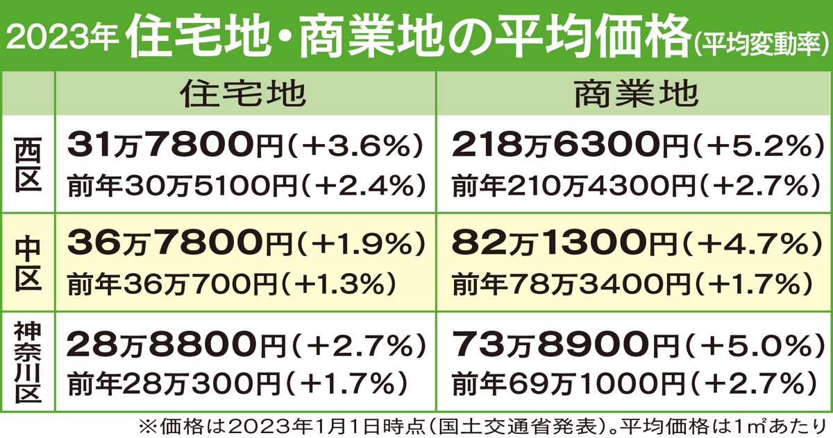 国交省が公表している2023年1月1日時点の公示地価によると、横浜市では住宅地の平均変動率は1・5%(前年0・8%)と上昇率が拡大。市東部や中心部は交通利便性が高いことから底堅い需要に支えられ、高い上昇率を示した地点も見られた。相鉄・東急直通線の開業効果が期待できる駅の周辺地域は、需要が堅調で上昇が継続している。中でも西区の上昇率は3%以上で、個別の地点では県内上昇率順2位。神奈川、港北、都筑区の3区で2%以上に。価格順では中区が県内2位になっている。