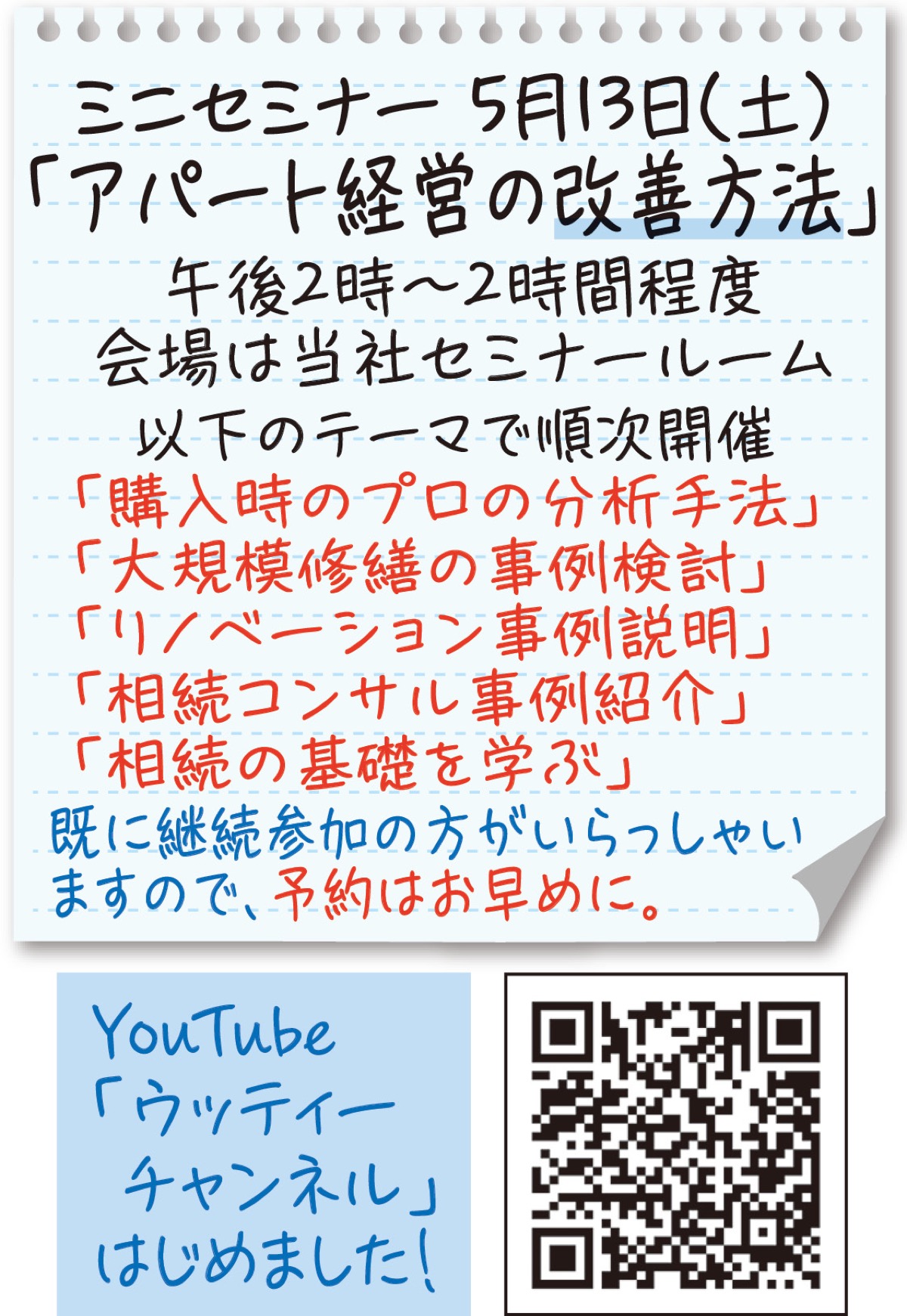 1月より毎月開催してきたミニセミナーが好評につき、5月以降も継続します。5月13日(土)にはアパート経営と相続対策のセミナーを行います。