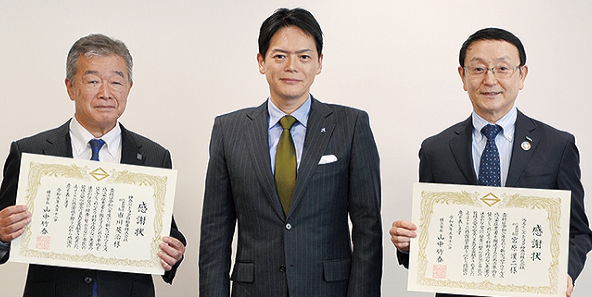 神奈川トヨタ自動車(株)(市川英治社長)=神奈川区=とウエインズトヨタ神奈川(株)(宮原漢二社長)=中区=が5月12日、横浜市の新型コロナウイルス感染症対策へ協力したとして、山中竹春市長から感謝状が手渡された。