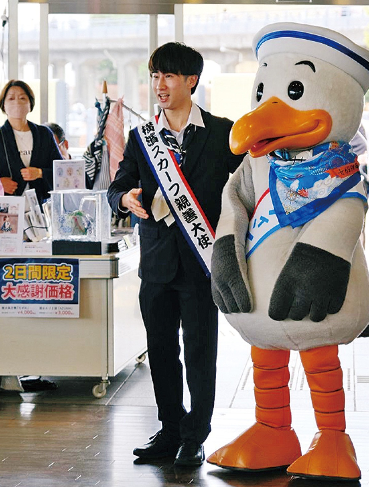 横浜スカーフ特別大使に就任したお笑い芸人・ぺこぱのシュウペイさんの等身大パネルも設置され、撮影スポットとなっていた。
