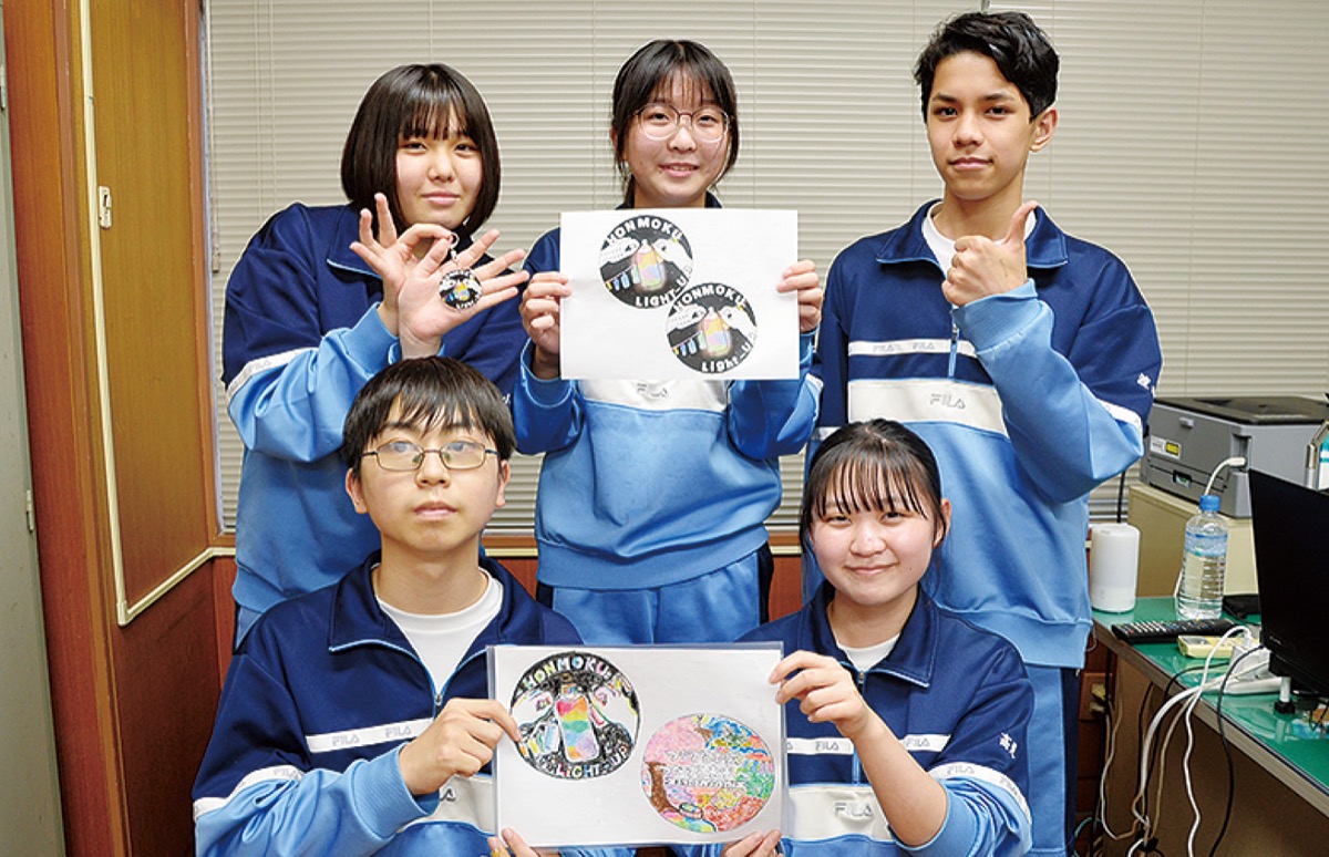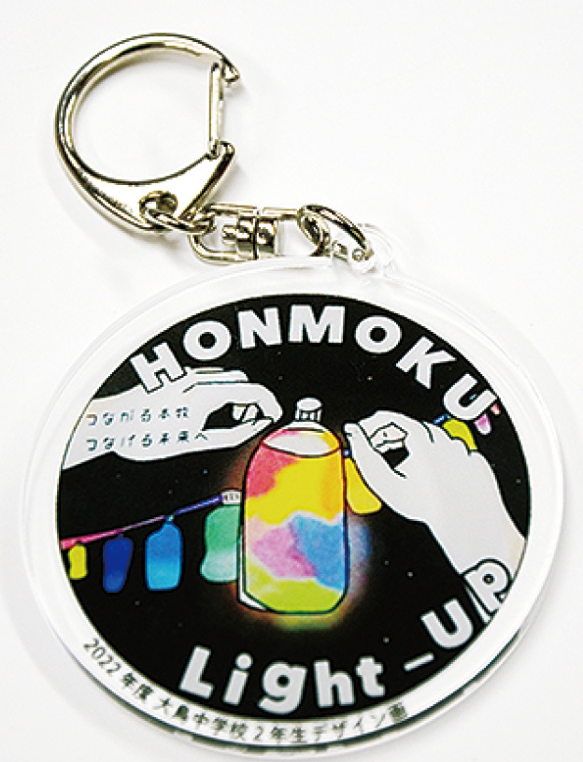 生徒らがデザインしたのは、お馬流しに合わせて開催される参加型イベント・本牧ライトアッププロジェクトをデザインしたキーホルダー。ペットボトルに入ったLEDライトが暗闇の中で幻想的に光る様子を描いた。