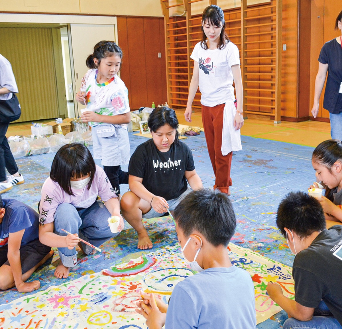 花や虹などの好きなモチーフやカラフルな模様、中には足や手に絵具を付けてダイナミックに描く児童も。「頭を使う絵は大人になってからいくらでも描ける。自由な絵は今しか描けない」と大野さん。あえて細かい指導はせず、自由に描いてもらうようにしたという。作業後に行われた質問タイムでは、上手な絵の描き方のコツを児童から聞かれ「よく観察すること。8分見て2分描く」など具体的なアドバイスを行っていた。