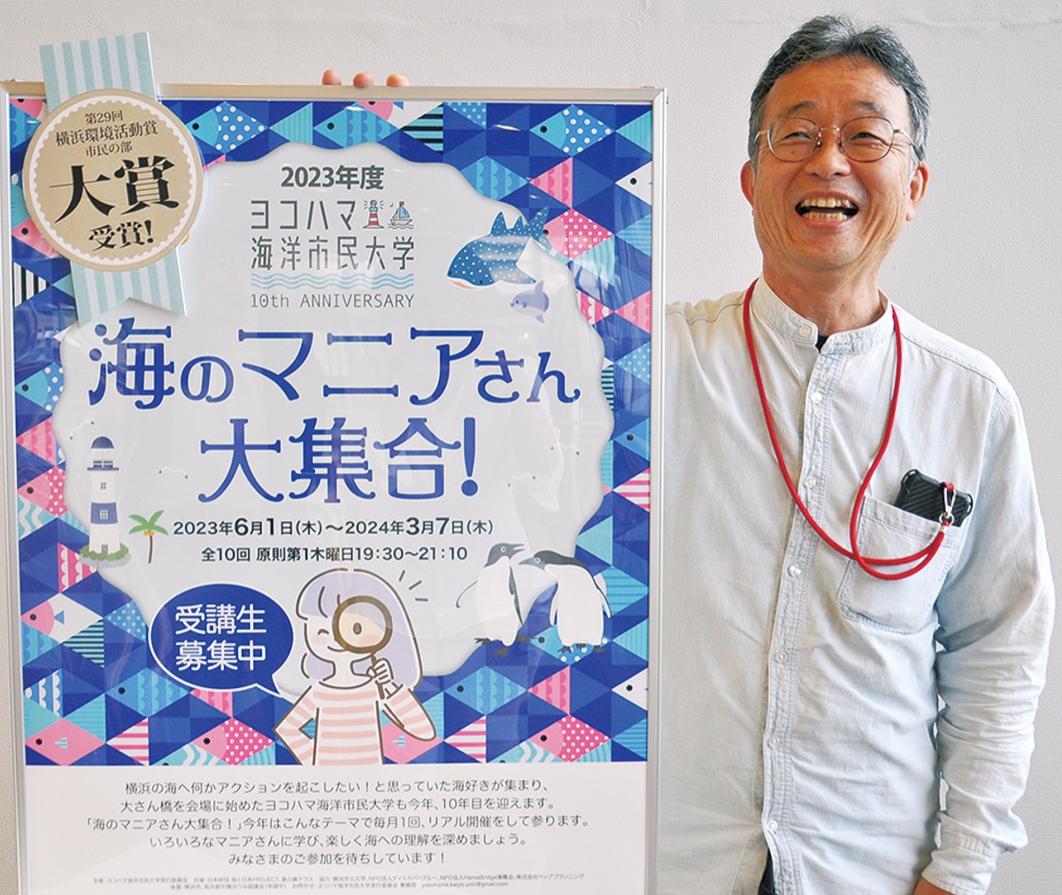 海洋市民大は、横浜の海の抱える社会問題を自ら考え解決に向けて行動できる人を養成する講座を年間10回、コロナ禍以前は20回開催しており、今年6月に設立10年目を迎えた。活動は大さん橋で始まり、現在は象の鼻テラスを拠点に行っている。講座は大学教授や釣り研究家、ダイバーなどの外部講師がそれぞれの視点から海洋生物や海のゴミ問題などについて講話をする。これらの活動が評価され、昨年度には横浜環境活動賞市民の部で大賞を受賞している。