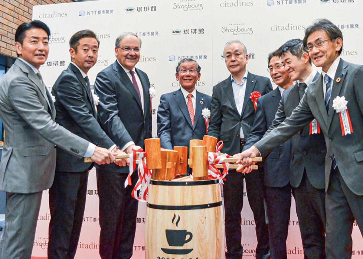 6月14日の開業当日に行われたオープニングセレモニーには、平原敏英横浜市副市長をはじめとする来賓や関連企業の代表が登壇。NTT都市開発の辻上広志社長は「ホテルやコーヒー、バウムクーヘン、電話交換業務など日本の発祥地としてゆかりある横浜で再結集した。横浜の活性化に貢献し、街と一体となって地域の皆様に長く愛される施設にしたい」とあいさつ。ホテルのコミュニケーションツールとなっているコーヒーで、鏡開きが行われた=写真。