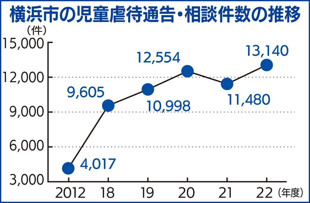 横浜市内の児童虐待の通告・相談件数は年々増加を続け、19年度に1万件を突破した。さらに20年度には1万2000件を超え過去最多を更新したが、21年度は1万1480件と減少していた。22年度は前年比で1660件増加し再び過去最多件数を更新した。12年度の4017件と比較すると10年で3倍以上になっていることになる。
