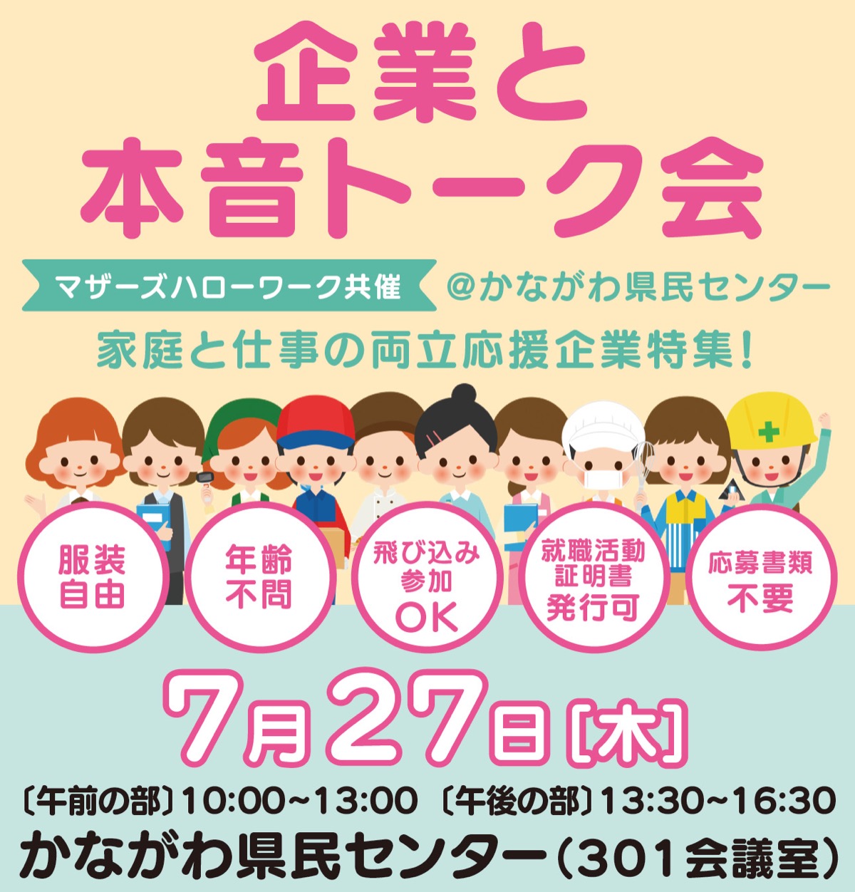 神奈川県はマザーズハローワークとの共催で7月27日(木)、育児や介護等で離職し、再就職を考えている人や、ワークライフバランス重視の就職活動を行なう人を対象に企業説明会・座談会を開催する。会場は横浜駅西口徒歩5分、かながわ県民センター。午前(10時〜13時)、午後(13時30分〜16時30分)の2部制で、各3社程度が参加。企業PRの後、企業ブースで座談会形式の質疑応答を実施。子連れ参加可能(託児・保育無し)。
