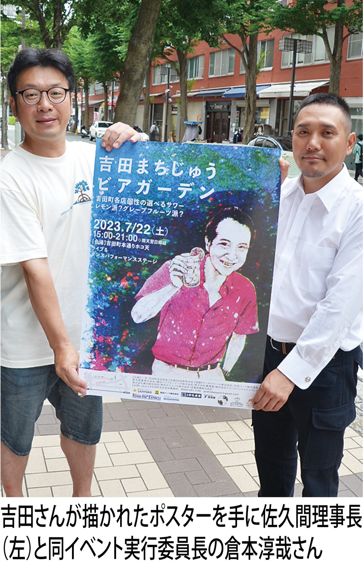 今年のポスターのモデルになったのは、主催の吉田町名店街会の前理事長である故・吉田和正さん(享年56歳)。今年5月7日、がんで亡くなった。吉田さんは2018年から同会の理事長に就任。ビアガーデンやノラねこ通り、こども縁日の新設など街のために奔走した。「よしだちょう」と読み間違えられることも多い中「吉田町(まち)の吉田です」を合言葉に、街の知名度アップに貢献していたというエピソードも。理事長を継いだ佐久間衛さんは「人脈も広く、人や街の橋渡し役的存在だった。吉田町を本当に愛してくれていた」と振り返る。