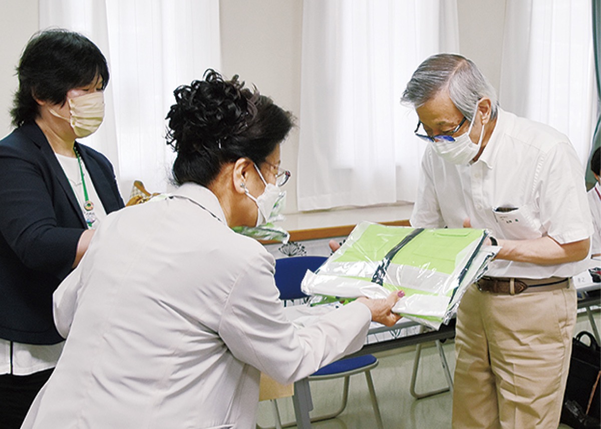 戸部・西前・本町の3小学校の通学路周辺をパトロールする「まもり隊」に、西区第一地区町内連合会(粕川幹代会長)から活動時に着用するビブス=写真下=がプレゼントされた。7月7日に宮崎地域ケアプラザで行われた感謝会で粕川会長から、各町内の代表者に手渡された。