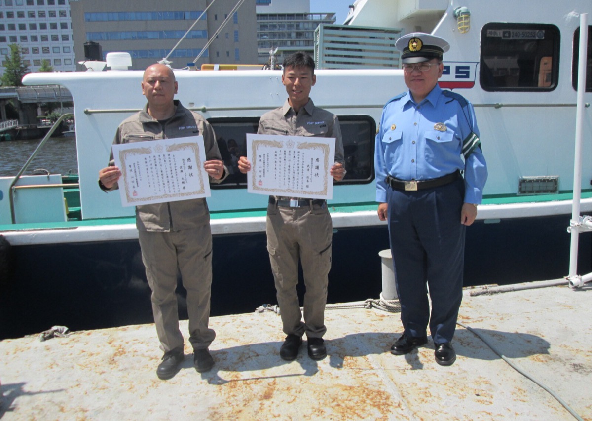 横浜水上警察署は7月11日、横浜港での人命救助に協力したとして、シーバスなどを運航する株式会社ポートサービス=中区山下町=の船員2人に感謝状を贈呈した。