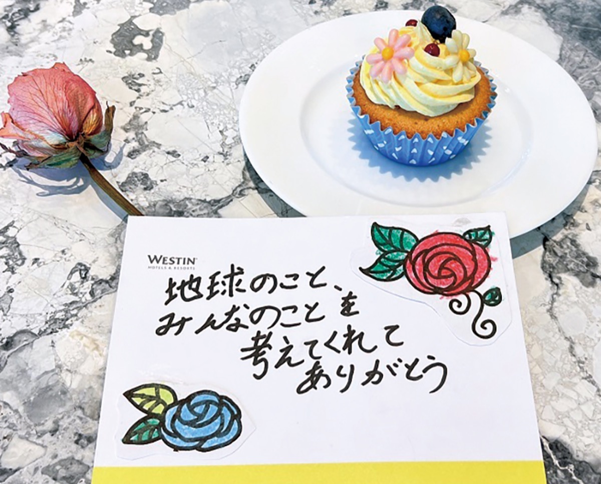 同ホテルのコンセプトでもあるSDGs達成に向けた取組の一環。1周年記念の装飾に使用したバラのドライフラワーを、1輪ずつラッピング。ホテル23階ロビーで行われた募金活動に協力した人たちに配布した。また、みなとみらい本町小学校と協力し、3年生の児童らが寄付者に向けた手書きのサンキューカードを作成。バラの花と一緒に手渡し、ホテルパティシエ特製のカップケーキも合わせてプレゼントされた。