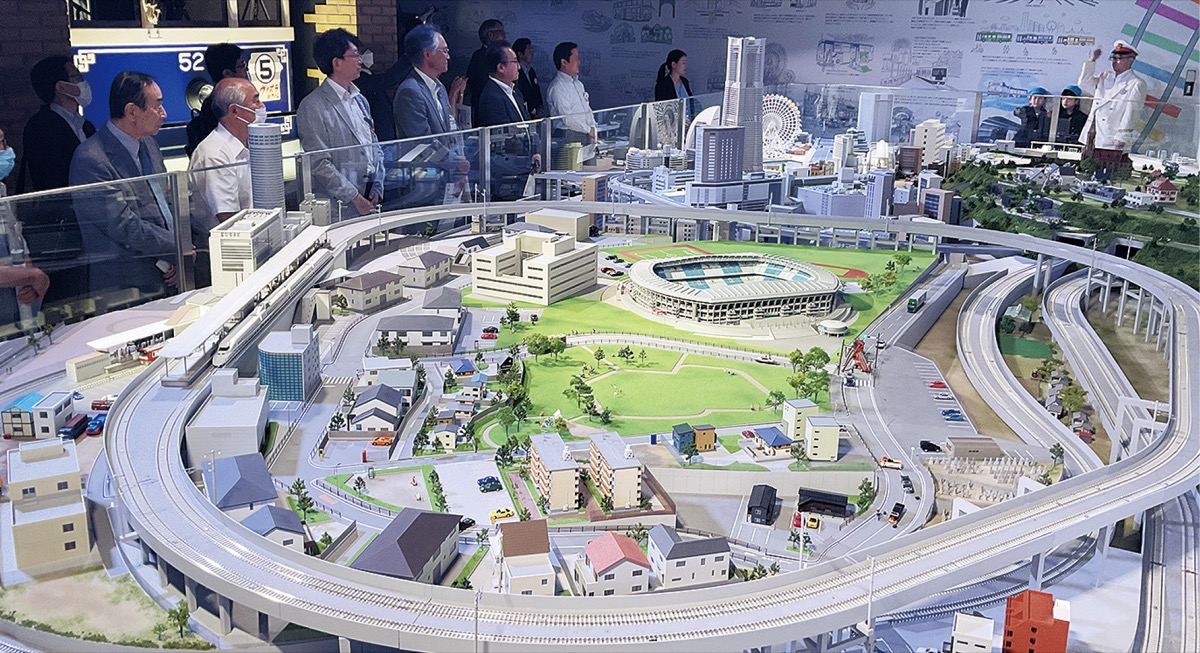 ジオラマは長さ9・5m、幅3・5m。模型車両はHOゲージを採用。日産スタジアムやみなとみらいの観覧車など現在の横浜を象徴する建物も配置。市営地下鉄や新幹線、京浜東北線などの模型車両は有料で2分間、運転体験ができる。