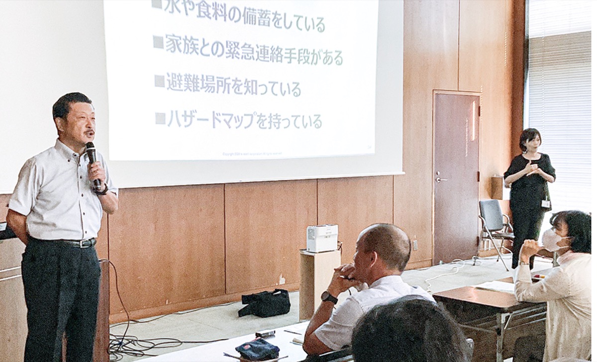 テレビ朝日広報局お客様フロント部で、防災士として活躍する久慈省平さん(58)=青葉区在住=が講師を務めた。久慈さんは、東日本大震災で東北3県の現地デスクを務めるなど数多くの災害報道に携わってきた経験から、メディアの視点で防災について解説。後半では今年発生から100年を迎える関東大震災の写真やデータを紹介したほか、中区の地形の特性を基に災害ごとの注意点にも触れた。