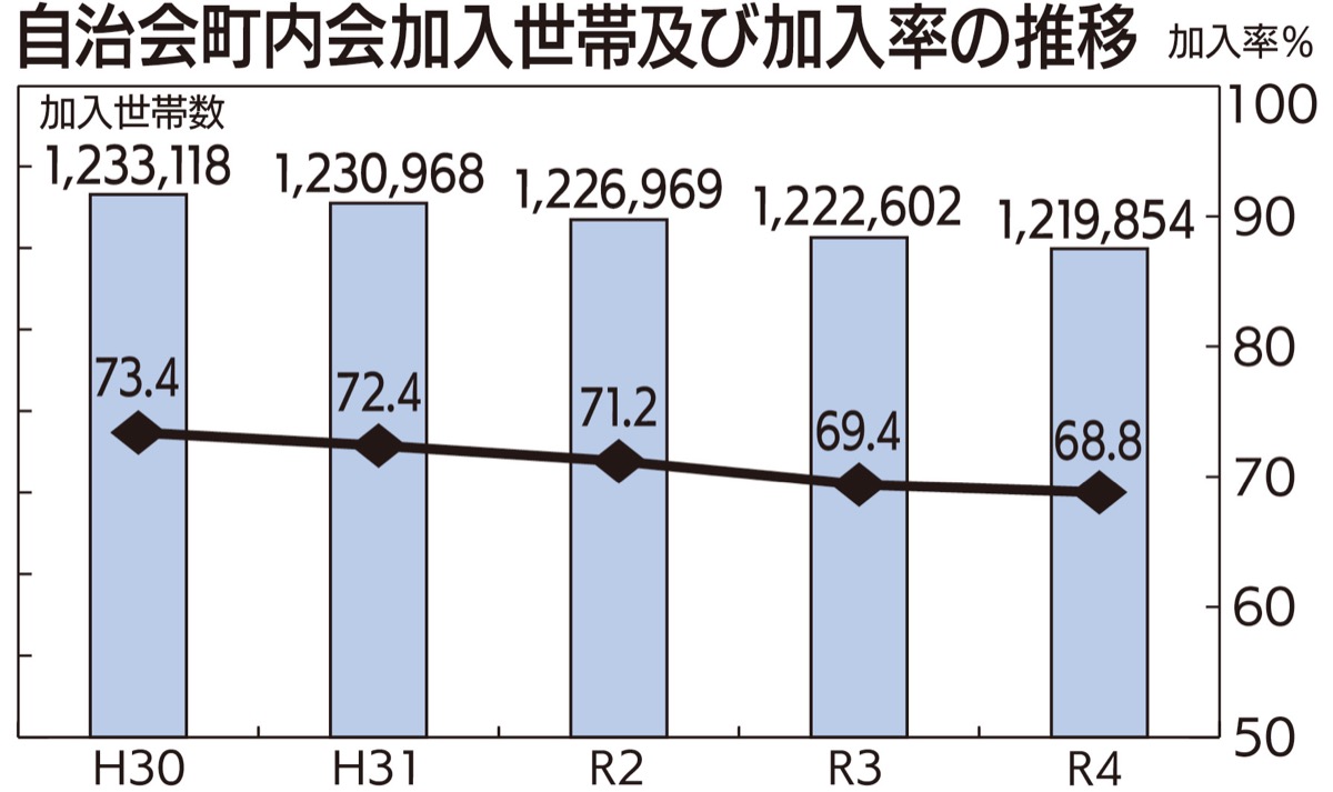 加入率は昨年4月で68・8%、5年間で4・6ポイント減少している=表参照。同時期で中区は60・5%、西区は62・0%と、いずれも市平均を下回る状況だ。役員・委員等の担い手不足や高齢化、行政からの依頼事務等への負担感などが課題となっている。