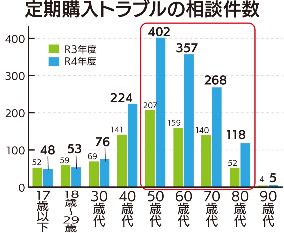 横浜市はこのほど、「令和4年度消費生活相談の傾向」を発表した。身に覚えのない定期購入など「意図しない契約」に関するトラブルが多く、50〜80歳代では前年から倍増。市は、スマートフォンの普及でオンライン販売が一般化した影響とし、注意を喚起する。
