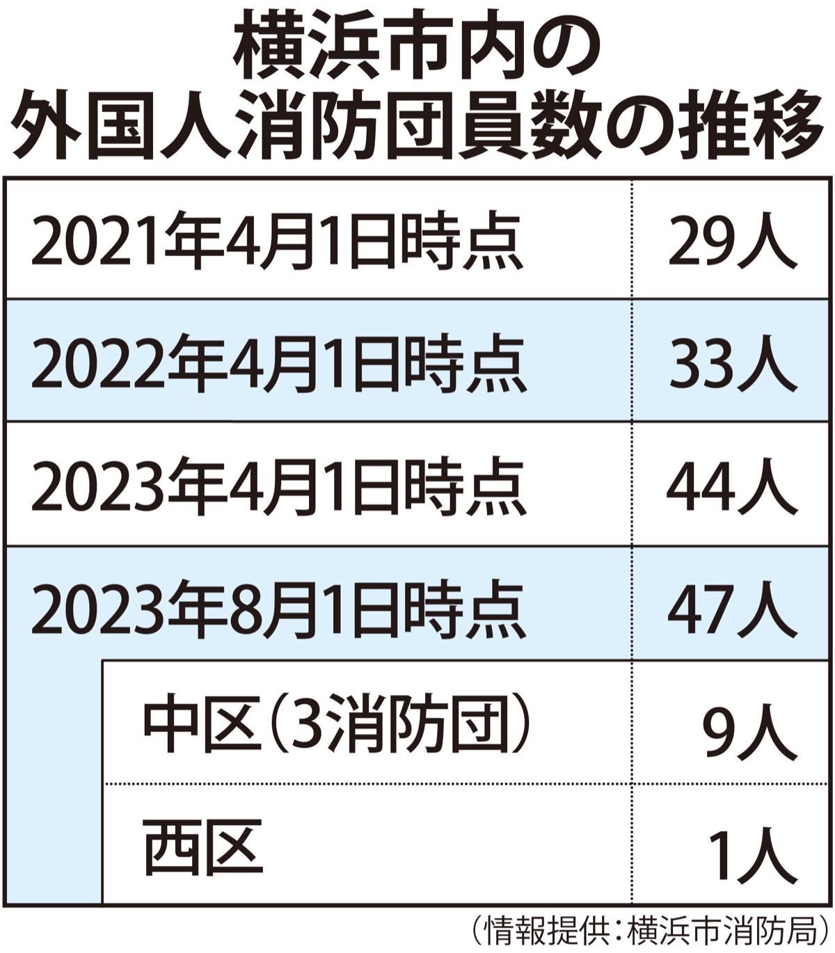 任用開始後、市内の20消防団で入団数の多寡はあるものの、外国人団員総数は年々増加。今年8月1日現在では47人が活動に従事しており、国籍別では中国人が最多(22人)で、次いで韓国人(8人)、ネパール人(5人)などと続く。市消防局の担当者は「使命感を持って入団してくれてありがたい」と話す。