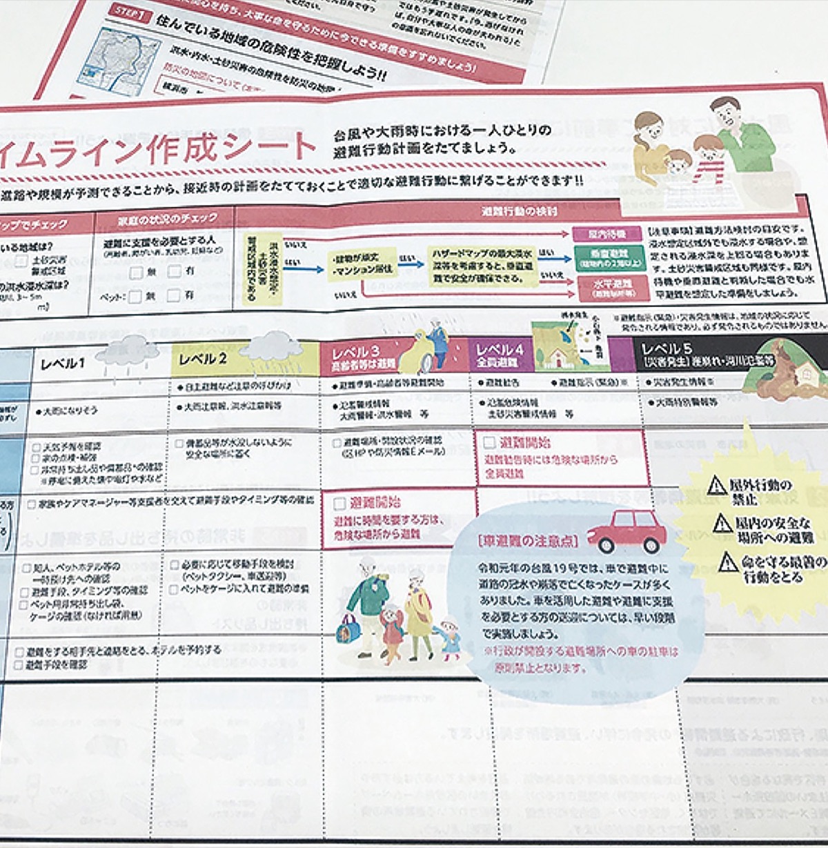 「マイ・タイムライン」とは、家族構成や地域環境に合わせて、避難行動を時系列で整理する行動計画のこと。災害の警戒レベルや避難情報に合わせて、避難手段やタイミング、備蓄品の持ち出しなど、行動の目安を確認しながら、自身の行動計画を立てることができる。横浜市は災害時の避難行動を一体的に支援する「横浜市避難ナビ」を産学と連携し制作。スマートフォンやタブレットでのマイ・タイムラインの作成を可能とし、災害時には同計画と連動した避難情報が通知され、開設している避難場所やルートが確認できる。(問)市地域防災課【電話】045・671・3456。