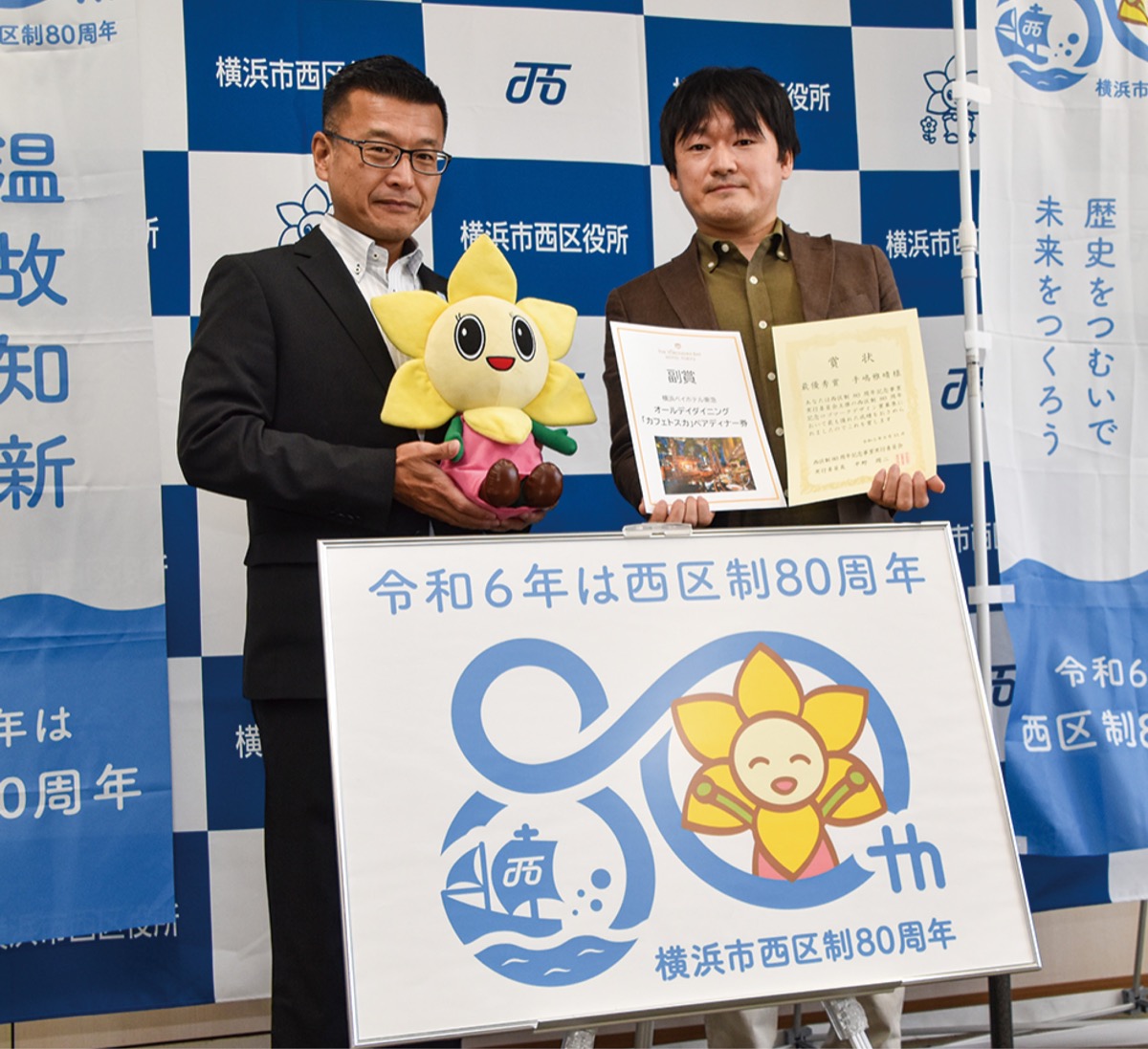 西区制80周年のロゴマークをデザインしたアートディレクターの手嶋雅晴さん(43)が、8月31日に西区役所を訪れ菊地健次区長から最優秀賞として表彰された。