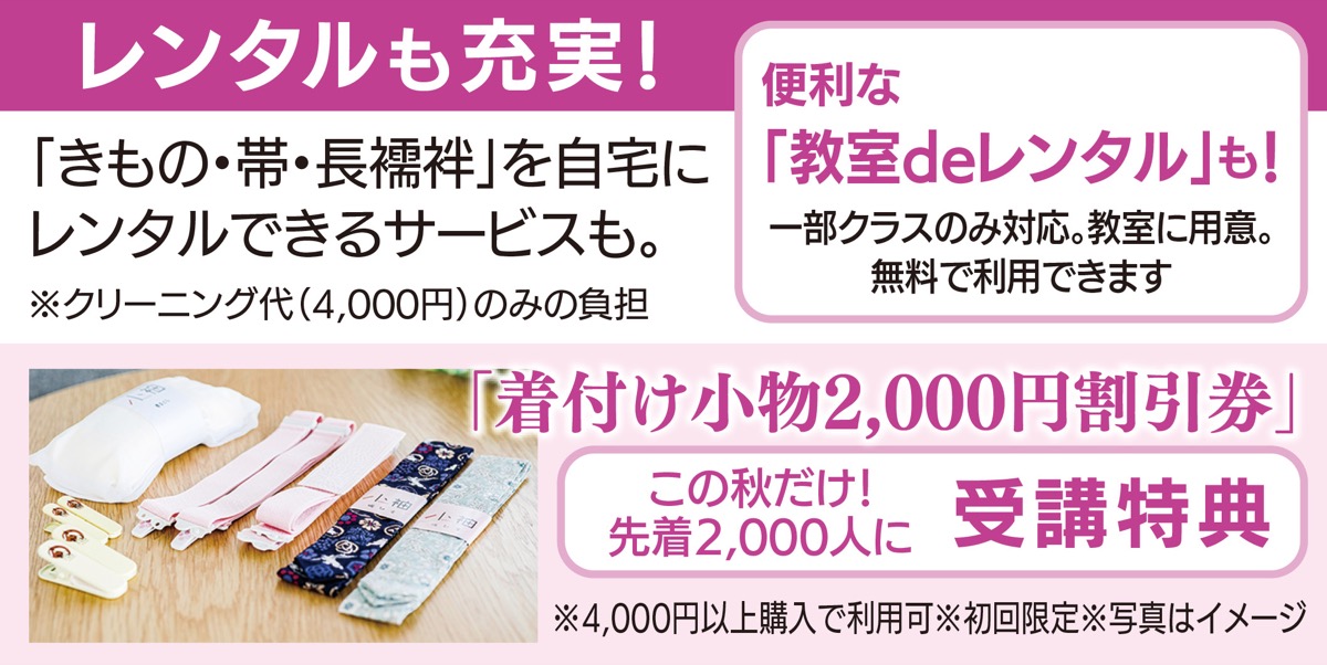 同社は今年で創業40周年を迎え、卒業生は21万人超を数える。毎年たくさんの人が、一人で「きもの」が着られるようになっている。「きものを着る人を増やして和装文化を守りたい」との想いから受講料は無料(一部自費の個人負担あり)。基本のカリキュラムは週1回2時間でレッスンはわずか6回。その後、継続することもできる(受講料はずっと無料)。さらに、通い放題のため補講や振り替えも可能だ。クラスは2〜5人の少人数制で、一人ひとりのペースに合わせた丁寧なレッスンなので、初心者でも安心だ。「早く、きれいに、簡単に」着られる「日本和装」だけの着付け方を身につけてみては。まずは問い合せを。