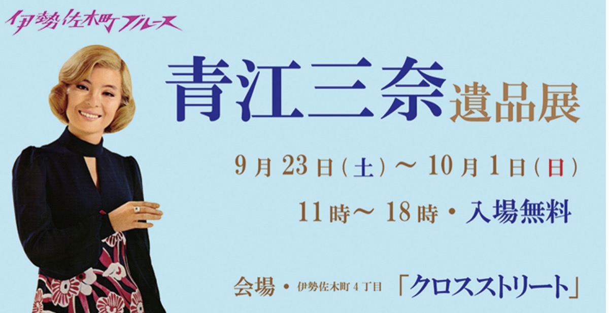 『伊勢佐木町ブルース』で知られる昭和の歌謡界を代表する歌手・青江三奈。その遺品展が9月23日(土)から10月1日(日)まで、イセザキモール沿いの多目的施設・クロスストリート=中区伊勢佐木町4の123=で開催される。午前11時から午後6時まで。入場無料。