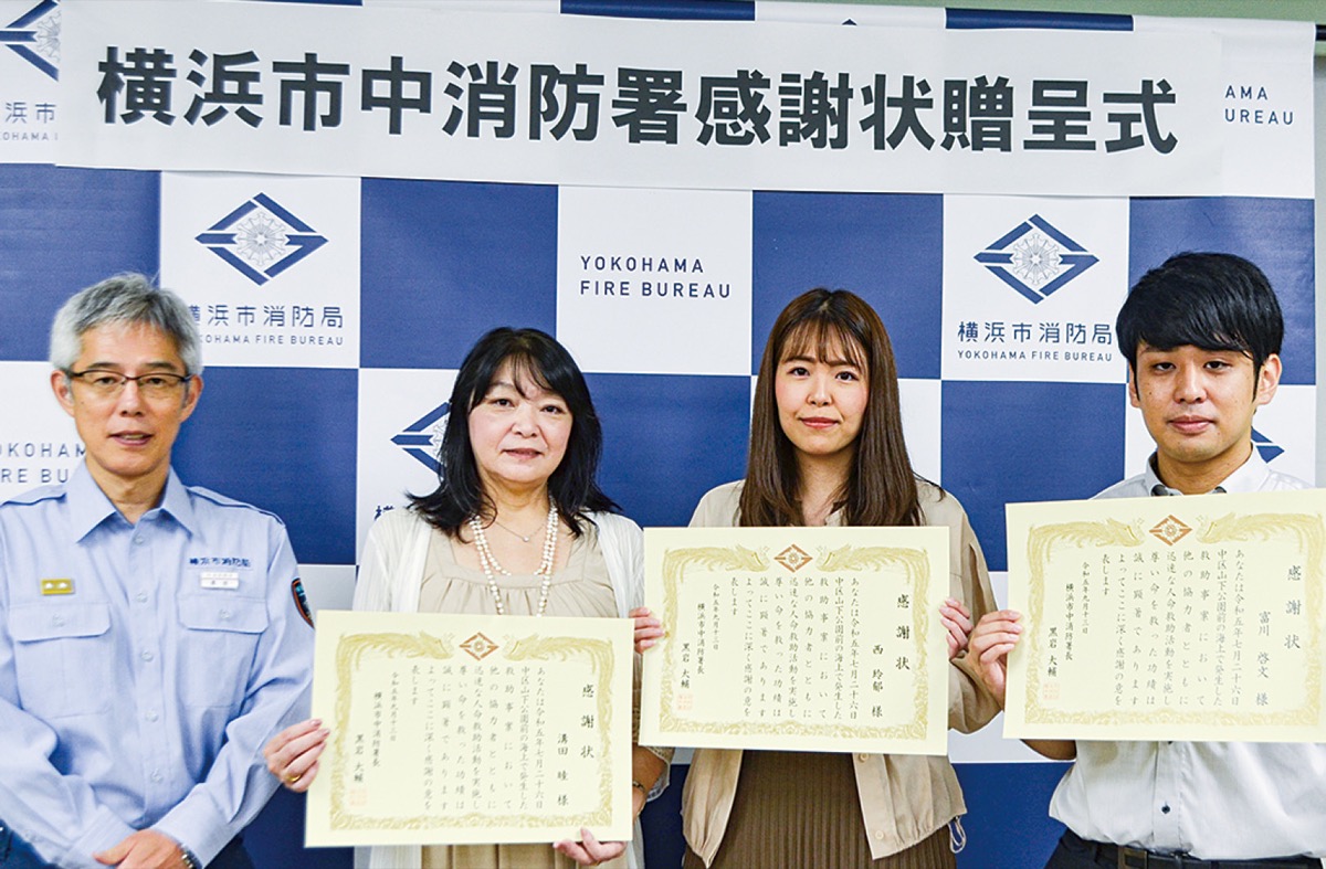 中消防署は9月13日、山下公園前海上において消防隊が到着する前に人命救助を行なったとして、発見から救助に携わった3人に感謝状の贈呈を行なった。
