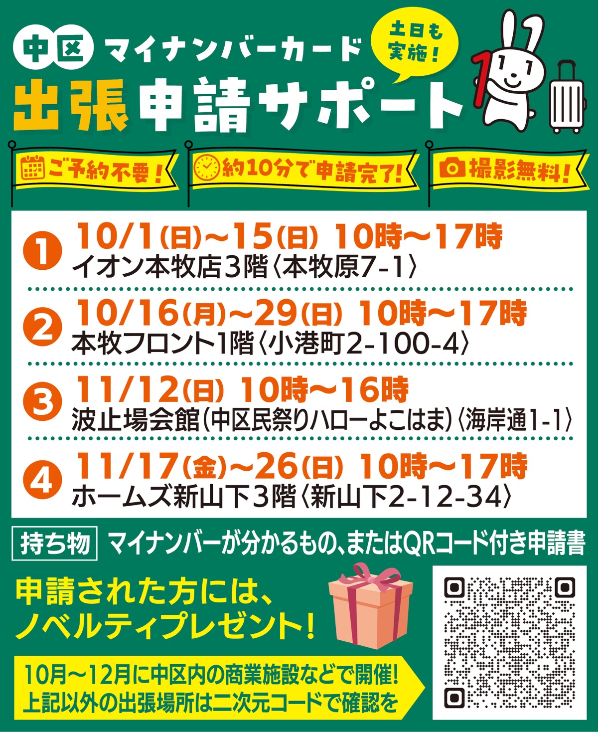 12月までで、土日も実施。受付は午前10時から午後5時まで(一部異なる)。上記以外の会場と日程は、中区役所のホームページ、または中区出張申請サポートコールセンター【電話】 050・8885・2193(午前9時から午後6時まで)に確認を。
