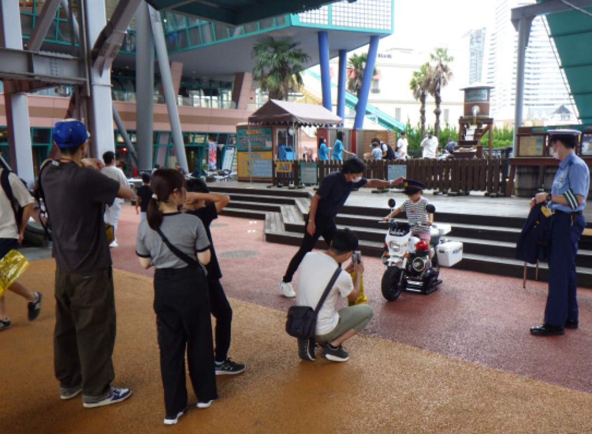 当日は週末の観光客でにぎわうなか、大観覧下の特設スペースを会場に、ミニ白バイやパトカーの体験乗車、自転車シミュレーターなどを実施。訪れた家族連れが楽しむ姿が見られた。また、横浜水上交通安全協力会や横浜立野高校の生徒も協力し、観光客らに交通安全を呼びかけながらチラシなどの啓発物が入った袋を配布した。