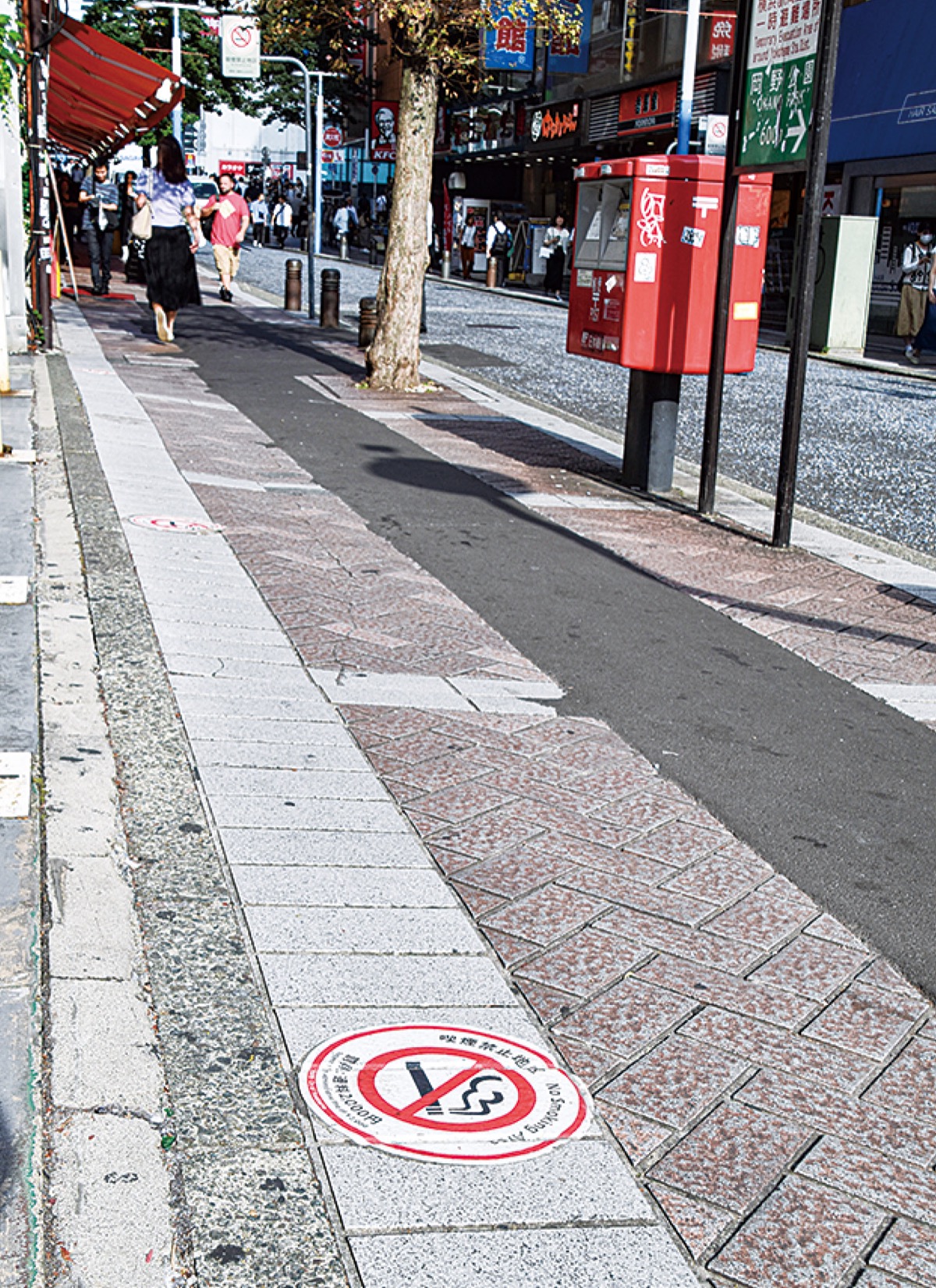 該当地区の路面には「喫煙禁止」を示す円形のシールが貼られている。また、道路標識のように周知する専用ポールも2本立てられた。