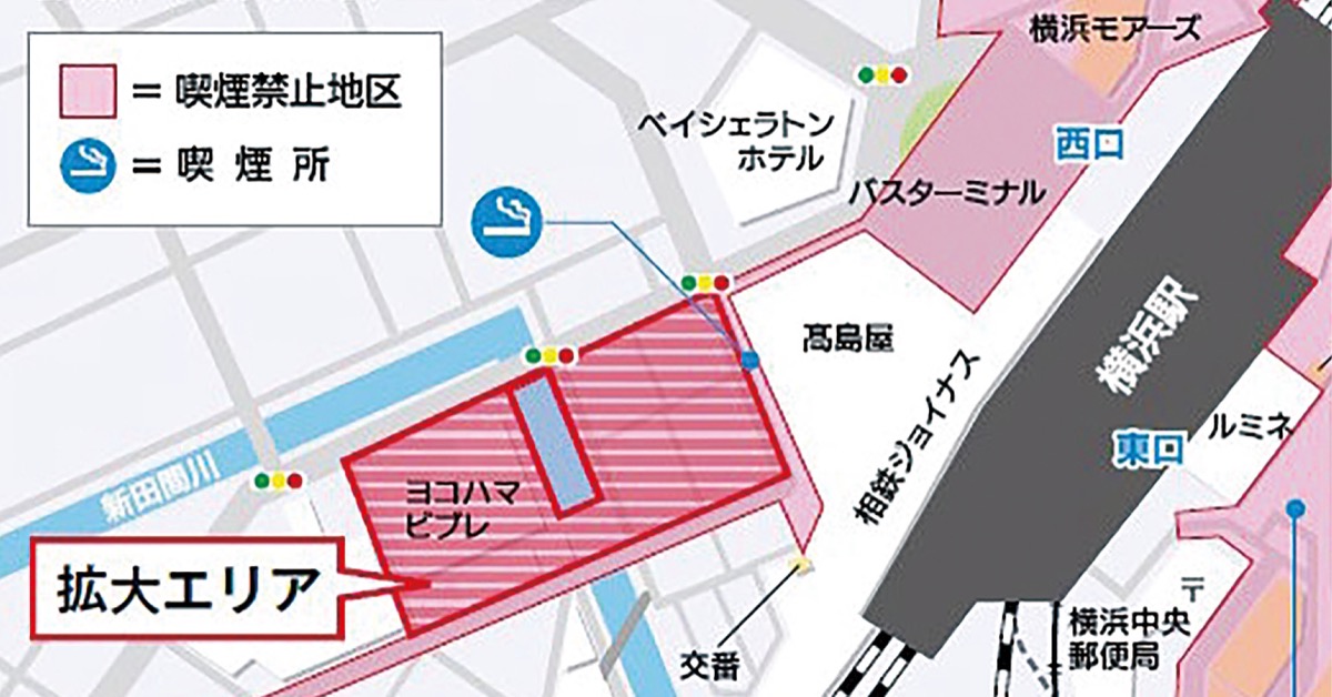 横浜駅周辺の喫煙禁止地区は、西口および東口ともに2008年1月に指定、09年3月に拡大され、計約6・2ヘクタールが対象となっていた。今回、西口の南幸1丁目から南幸2丁目の一部(約2・8ヘクタール)も含まれたことで、駅周辺の喫煙禁止地区は約9ヘクタールになった。