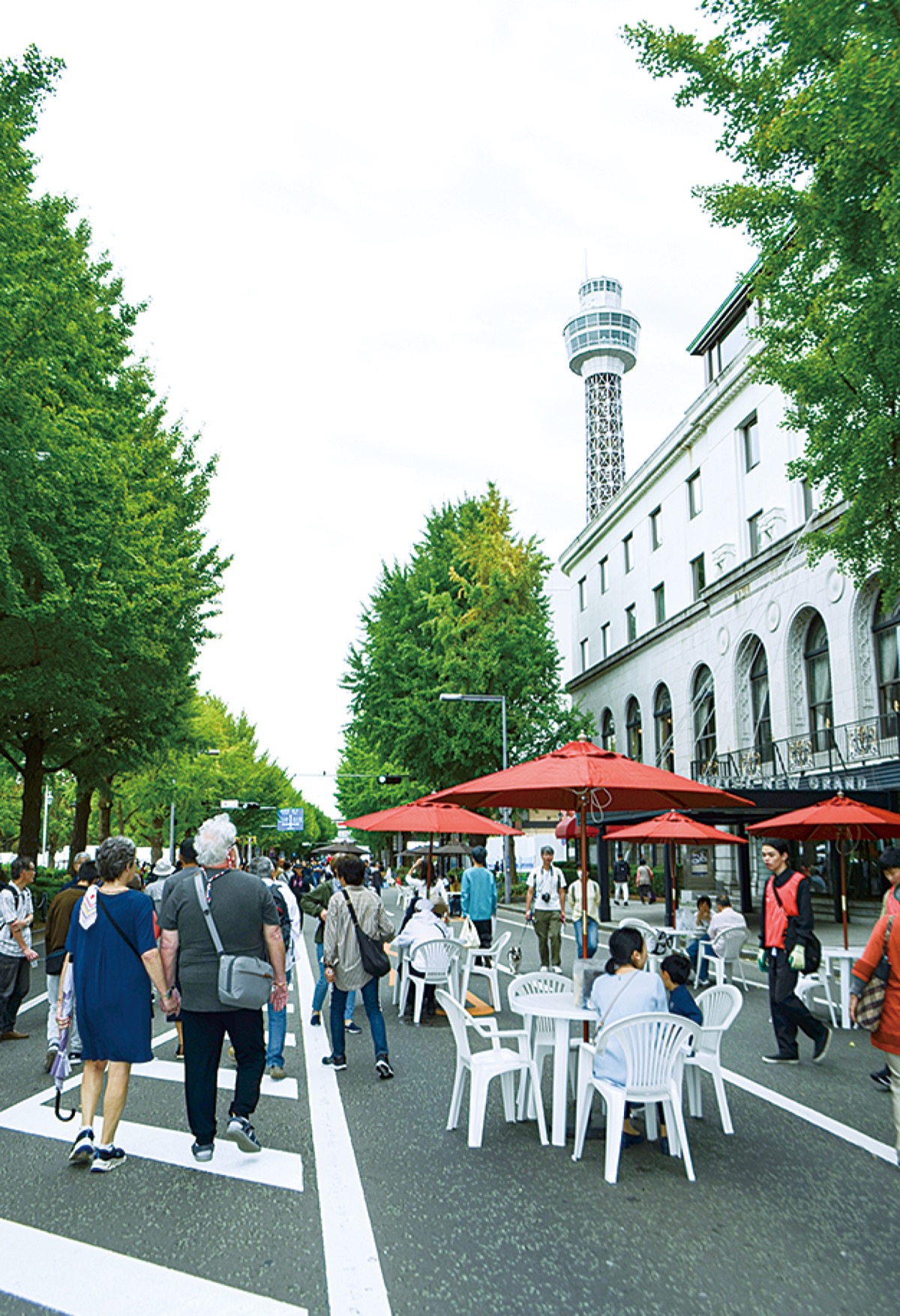 3連休の中日の10月8日、山下公園通りで初めてとなる歩行者天国が実施された。交通規制された開港広場前から山下橋までの通りは多くの歩行者でにぎわった。