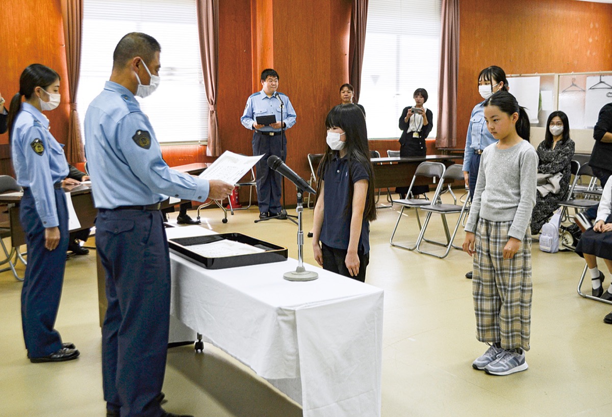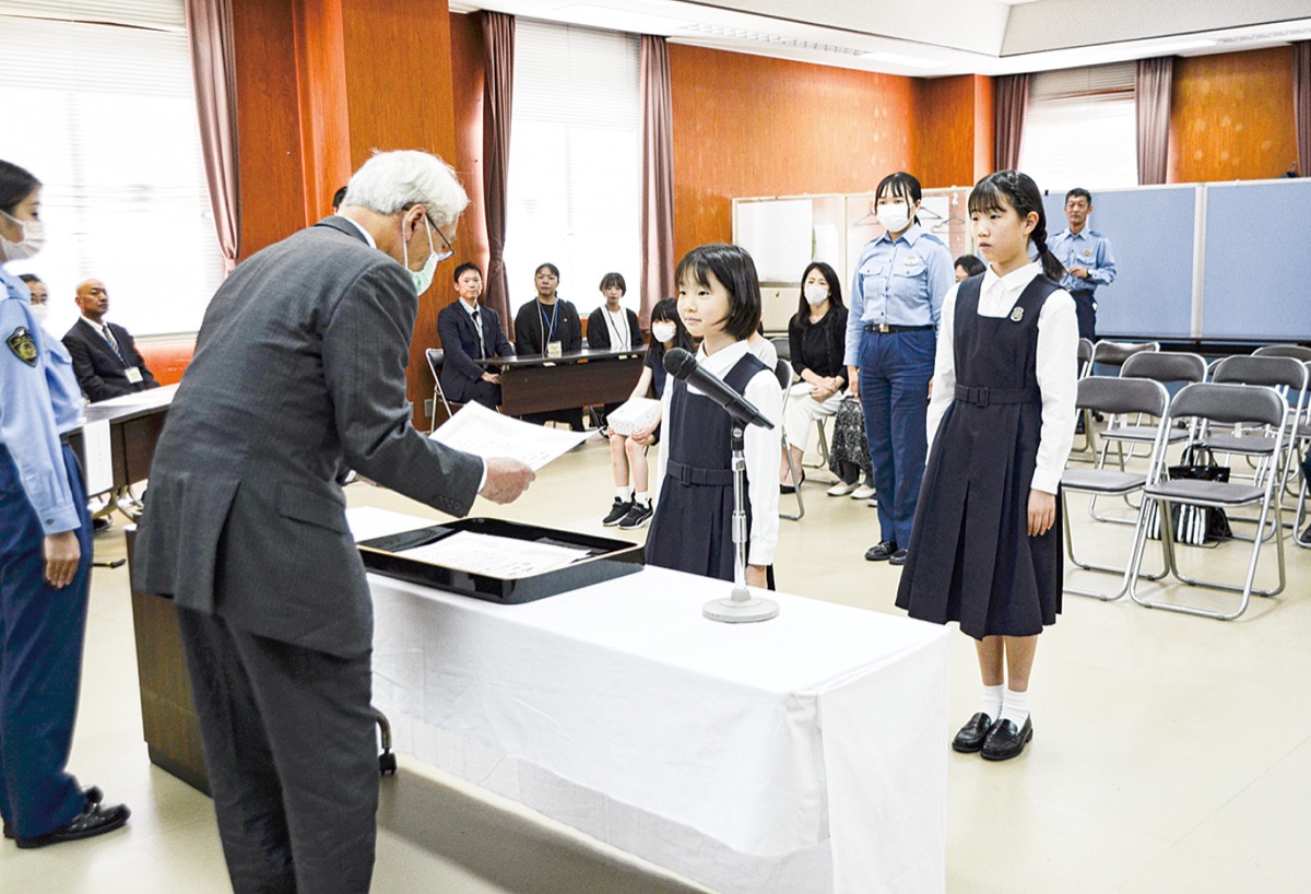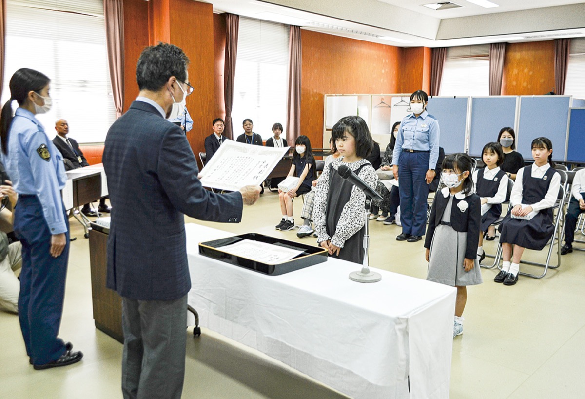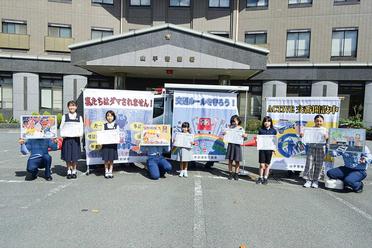 山手警察署は10月7日、小学生を対象に実施したアクティブ交番の掲示用イラストコンクールの表彰式を同署で行った。3つの部門を設け、金賞、銀賞の受賞者6人に賞状と副賞が渡された。