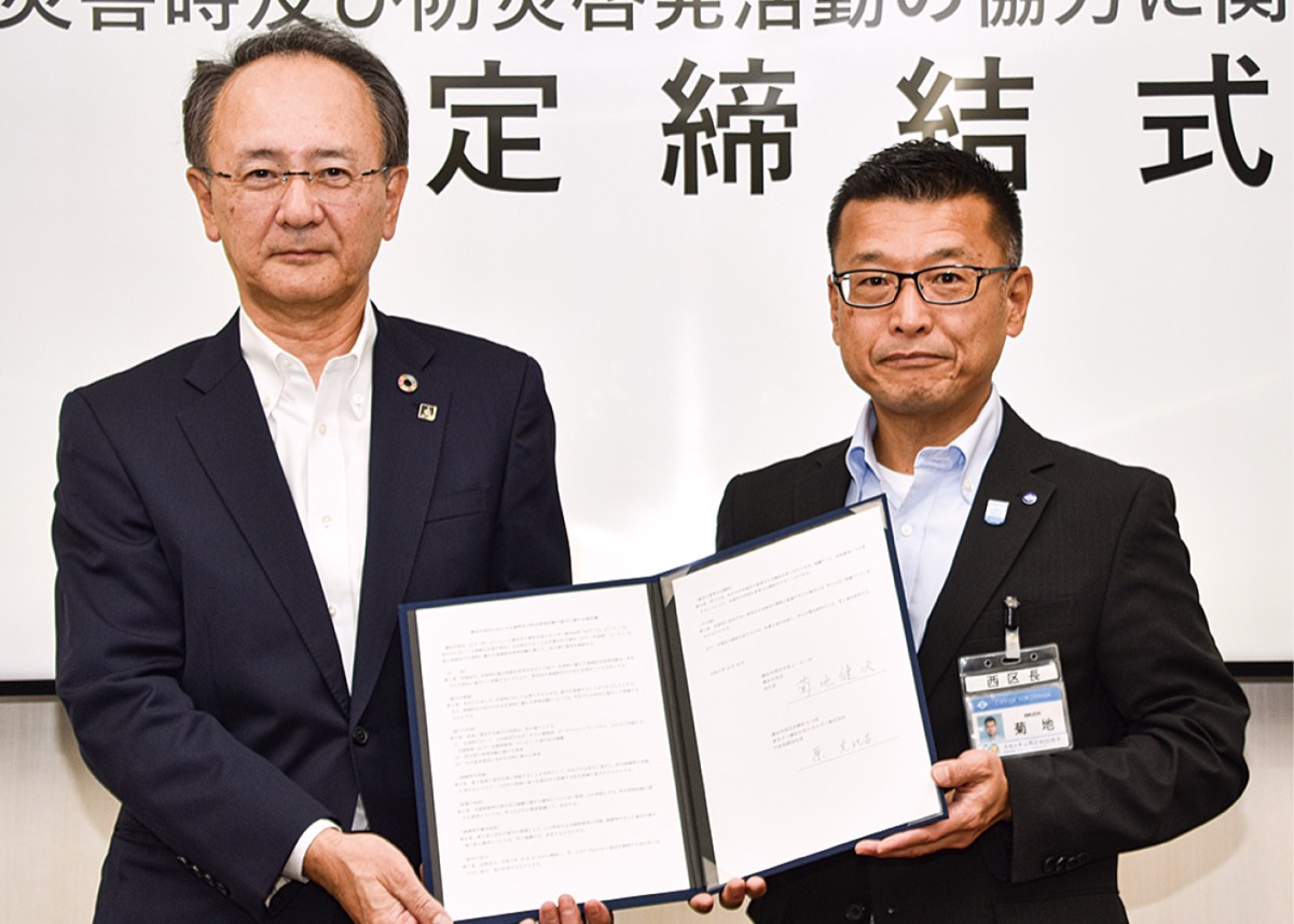 災害時の支援体制充実化、災害時に備えた地域防災啓発活動の相互協力により、西区内の地域防災力の向上が目的。具体的には、災害時に同社が保有するポータブル蓄電池とポータブルソーラーパネルの10セットを西区に貸与。避難所などに運搬する。蓄電池は626ワットアワーの充電容量があり、通常のスマートフォンを35台程度、フル充電することが可能。