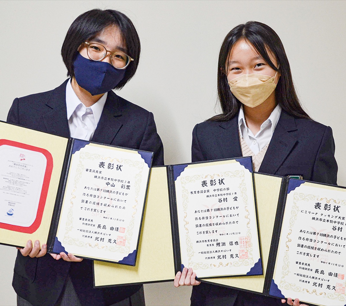 「第9回横浜の子どもが作る弁当コンクール」(主催/一般社団法人横浜すぱいす)でこのほど、本牧中学校の谷村愛さん(1年)が教育委員会賞、中山彩葉さん(3年)が審査委員長賞を受賞した。谷村さんは1位となる大賞にも選ばれ、ダブル受賞となった。