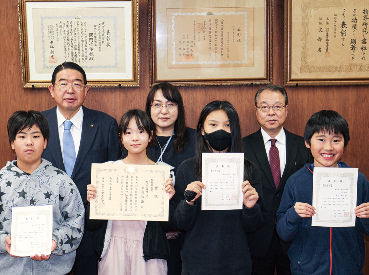 消費税などの間接税の正しいあり方を考える横浜中間税会(六川勝仁会長)が11月27日、間門小学校で「税の標語」の表彰贈呈式を行った。横浜中税務署長賞に選ばれた作品を手がけた芋川玲奈さんをはじめ、優秀賞の3人に六川会長から賞状が贈られた。いずれも6年生。