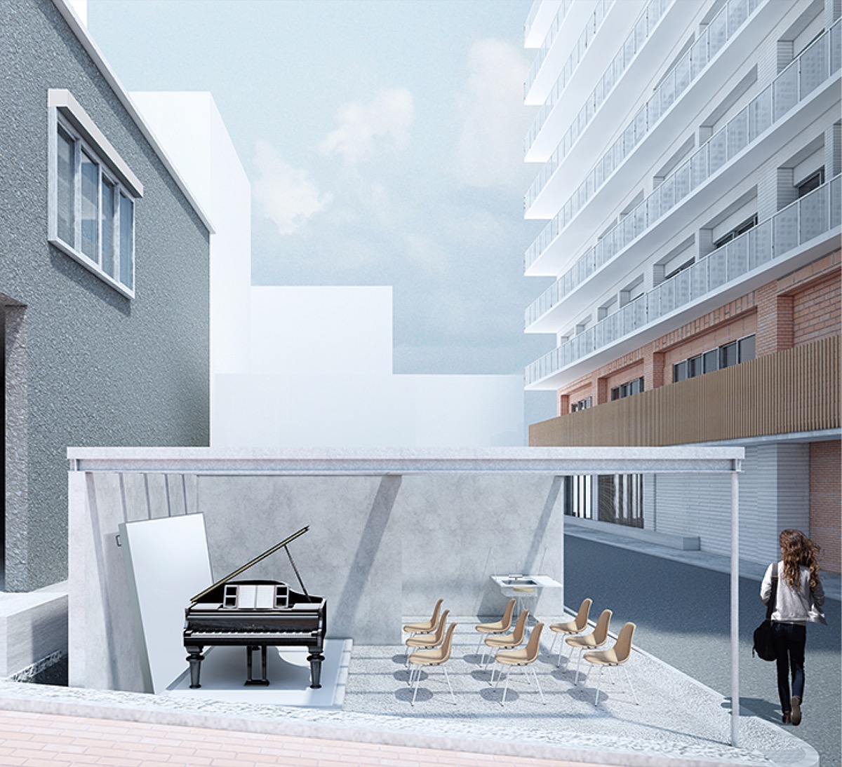 地上1階は道路に面したオープンステージとなっており、ジャンルにこだわらず若者を中心とした演奏活動ができる場所を提供する。地下にあるグランドピアノを昇降機で持ち上げ、地上のステージでも使用できるようにするという。