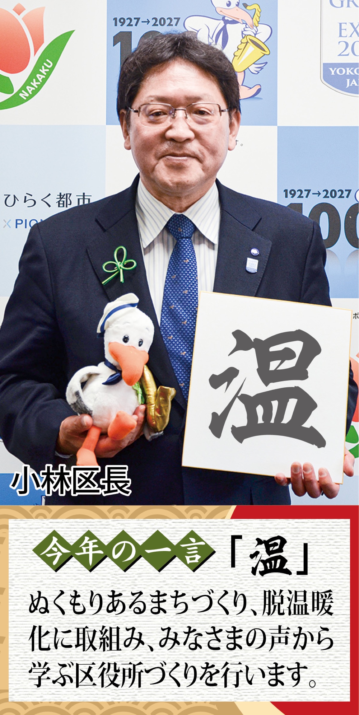 「区民の皆様の生活に必要不可欠な窓口業務や施設の管理などを、改めて気を引き締めて取り組みます。また、中区の街のにぎわいは横浜の街のにぎわいでもあります。地域の活動がますます活発化していくと予想されますので、私もいろいろなところにおじゃまして、交流を広げていきたいです。さらに、2027年には国際園芸博覧会、そして中区制100周年を迎えます。にぎわいを取り戻したり、地元を見直すきっかけとして、区民の皆様と共に機運醸成を図っていきたいです」