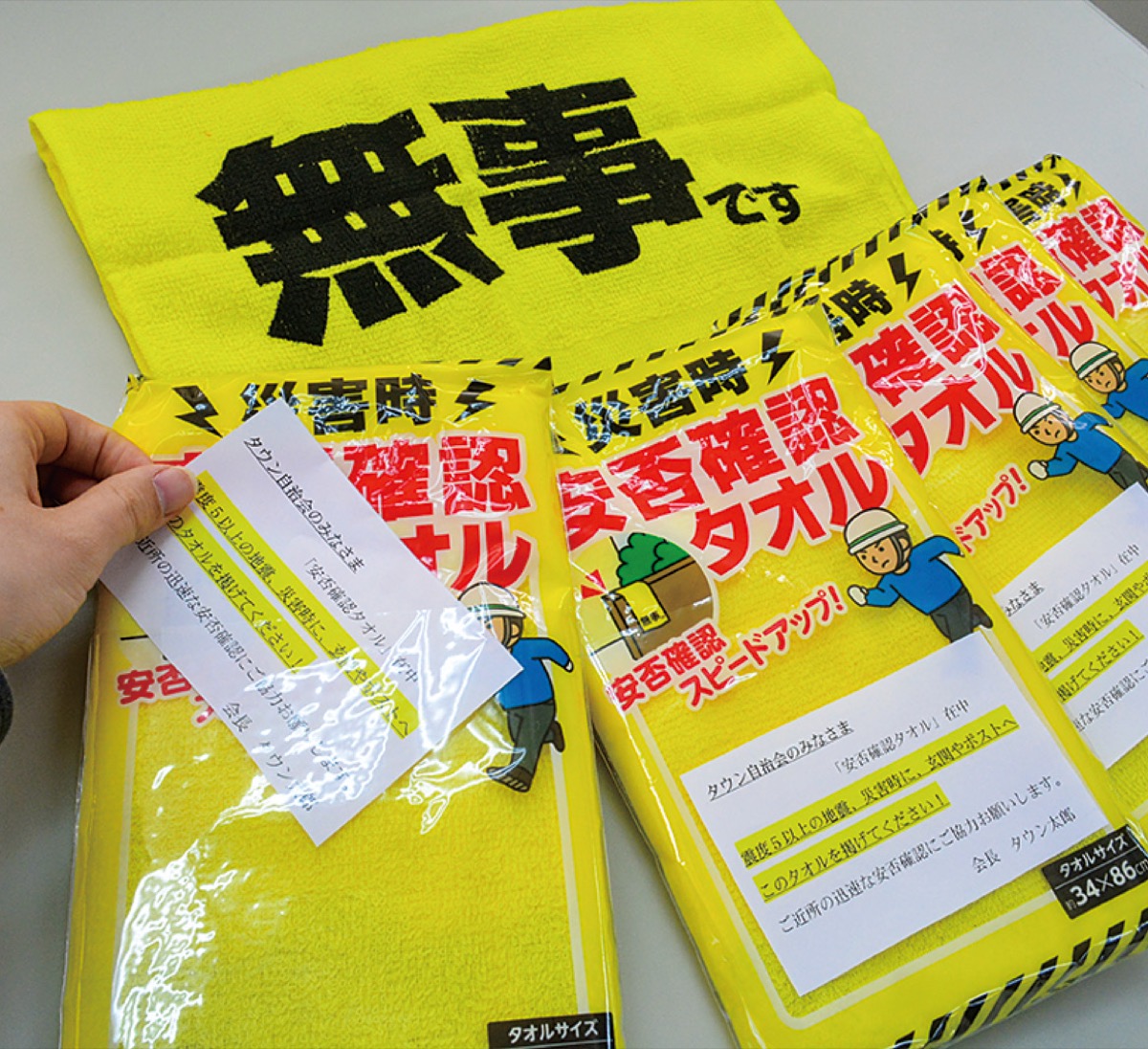 発災時「無事です」と書かれた黄色いタオルを外に掲げることで無事を周囲に知らせ、安否確認の手間と時間を省略化。貴重な人手を必要な場所へ回し、迅速効率的な救助活動につなげられる。