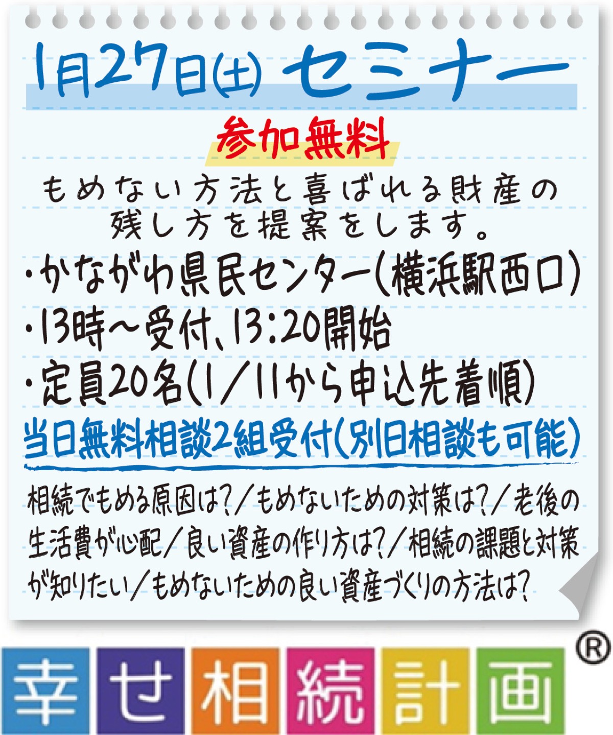 このコラム(中・西区版)も今回で100回目になります(感謝)。昨年からもめないための相続対策セミナーを開催しています(好評です)。