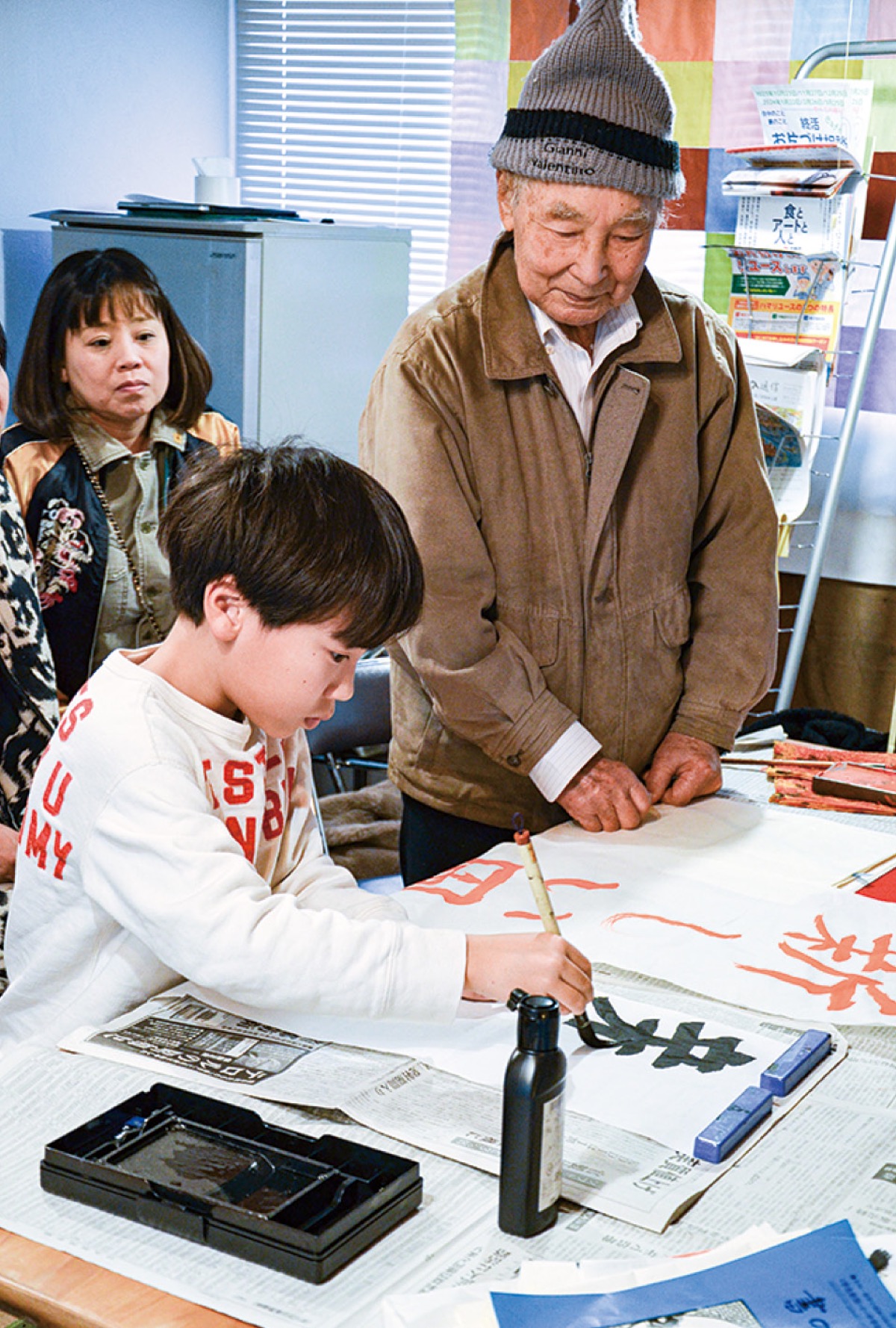 1月8日には介護予防プログラムに参加している山川達二さん(96)とマリンFMのパーソナリティーで書道師範の資格を持つ池田彩純さん(31)が講師となり、地域の小学生対象の初の習字教室が開催され、計6組の親子が参加した。子どもたちは「新しい風」「明るい心」などを集中して書きあげた。横浜中華学院3年生の澁谷空さん(9)は「友達と一緒に初めて来た。上手く書けて楽しかった」と笑顔を見せていた。