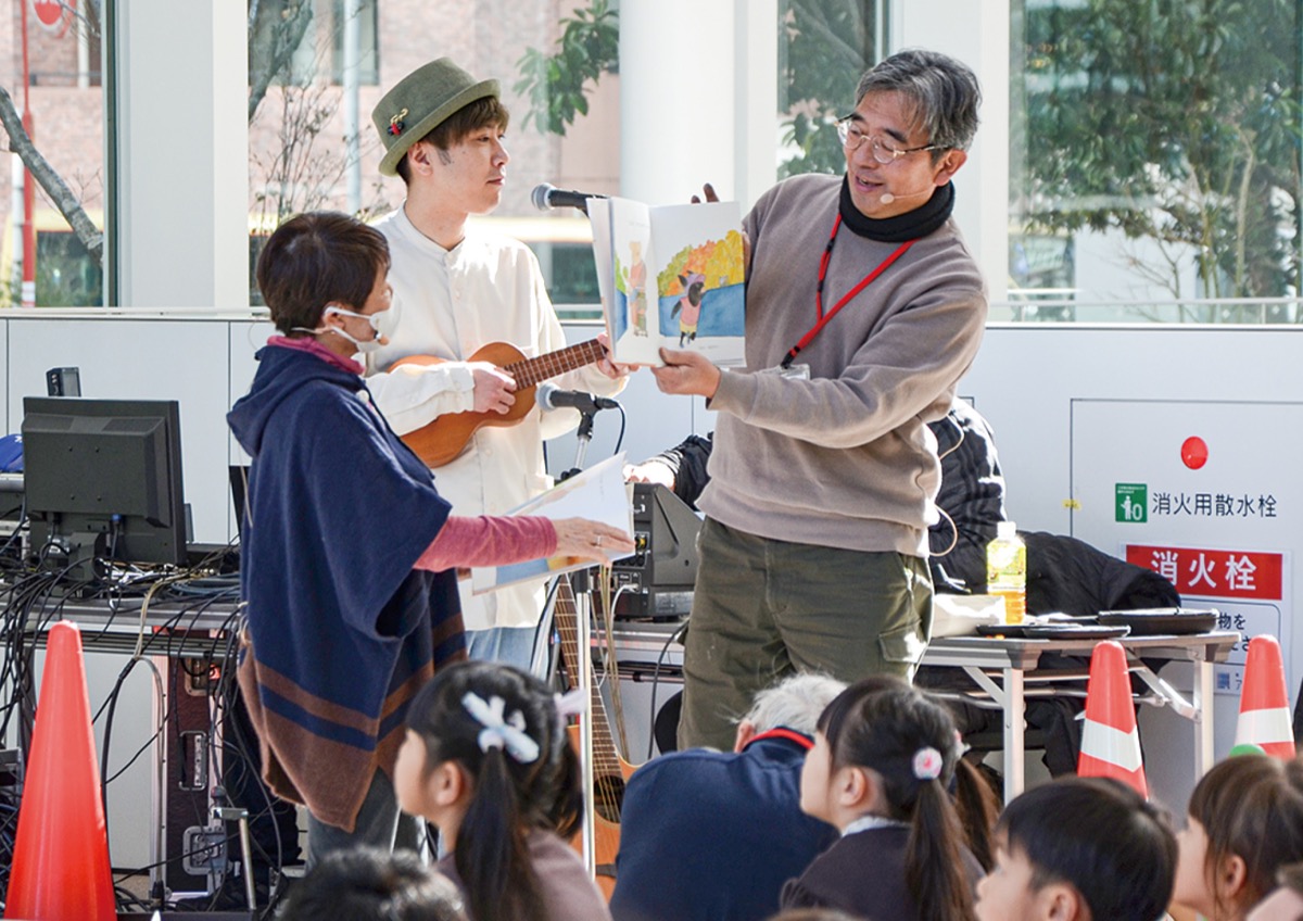 当日は約1000人の親子が参加し、56の出版社などから寄付された約300冊の絵本を楽しんだ。また、絵本作家のたかだしんいちさん(58)が楽器の生演奏をBGMに、親子関係などを描いた自身の絵本の読み語りを実施。会場の子どもたちは大画面に映し出された絵本を見ながら、物語の世界に入り込んでいた。たかださんは「こんな大勢の前で読み語りをするのは初めて。親御さんが近くにいてくれたので子どもたちは集中して聞いてくれました」と話した。